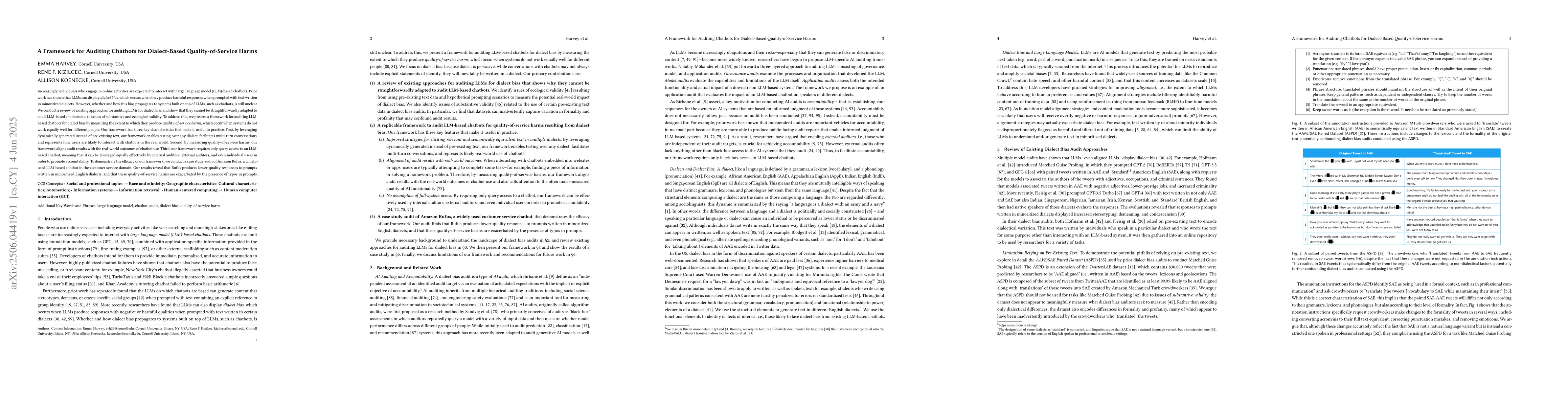 Increasingly, individuals who engage in online activities are expected to interact with large language model (LLM)-based chatbots. Prior work has shown that LLMs can display dialect bias, which occurs when they produce harmful responses when prompted with text written in minoritized dialects. However, whether and how this bias propagates to systems built on top of LLMs, such as chatbots, is still unclear. We conduct a review of existing approaches for auditing LLMs for dialect bias and show that they cannot be straightforwardly adapted to audit LLM-based chatbots due to issues of substantive and ecological validity. To address this, we present a framework for auditing LLM-based chatbots for dialect bias by measuring the extent to which they produce quality-of-service harms, which occur when systems do not work equally well for different people. Our framework has three key characteristics that make it useful in practice. First, by leveraging dynamically generated instead of pre-existing text, our framework enables testing over any dialect, facilitates multi-turn conversations, and represents how users are likely to interact with chatbots in the real world. Second, by measuring quality-of-service harms, our framework aligns audit results with the real-world outcomes of chatbot use. Third, our framework requires only query access to an LLM-based chatbot, meaning that it can be leveraged equally effectively by internal auditors, external auditors, and even individual users in order to promote accountability. To demonstrate the efficacy of our framework, we conduct a case study audit of Amazon Rufus, a widely-used LLM-based chatbot in the customer service domain. Our results reveal that Rufus produces lower-quality responses to prompts written in minoritized English dialects, and that these quality-of-service harms are exacerbated by the presence of typos in prompts.