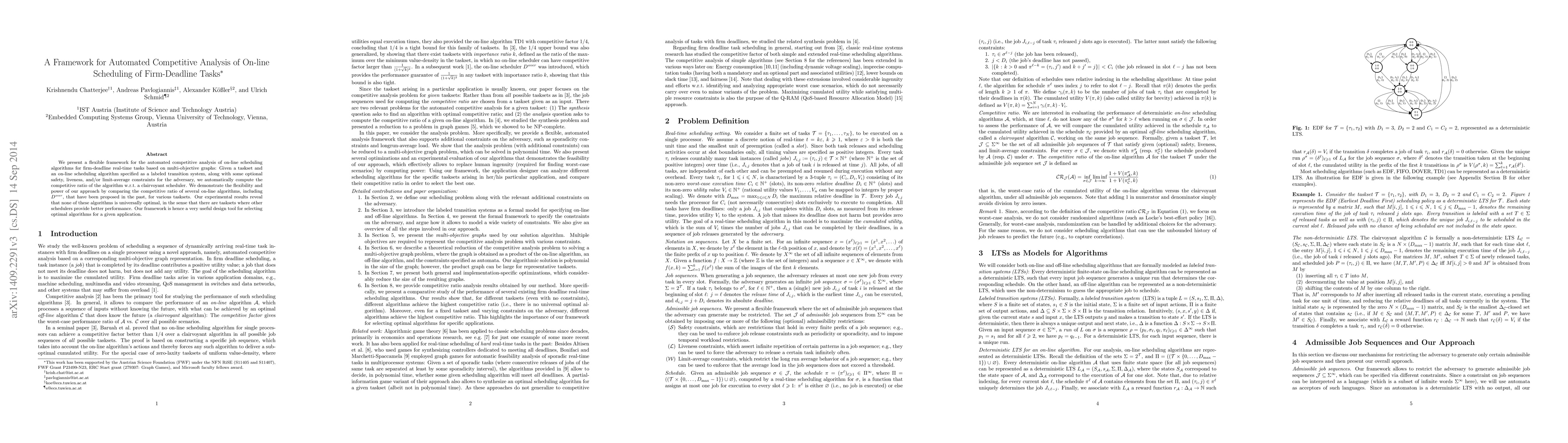 This paper introduces a framework for automated competitive analysis of on-line scheduling algorithms for firm-deadline tasks using multi-objective graphs. The framework computes the competitive ratio of various algorithms against a clairvoyant scheduler, revealing that no single algorithm is universally optimal across all tasksets.