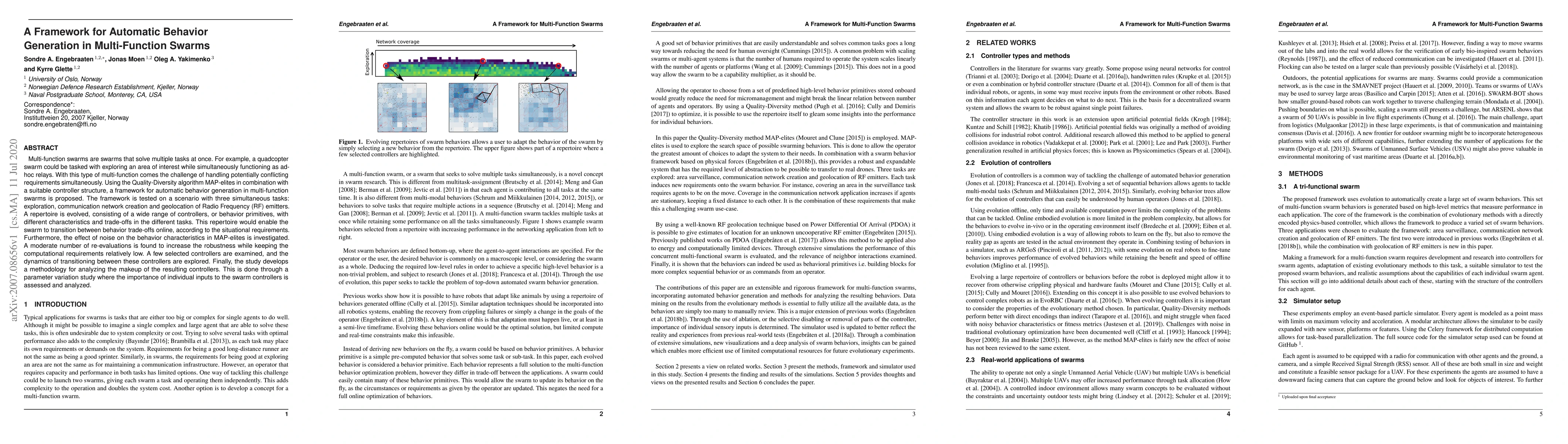 Multi-function swarms are swarms that solve multiple tasks at once. For example, a quadcopter swarm could be tasked with exploring an area of interest while simultaneously functioning as ad-hoc relays. With this type of multi-function comes the challenge of handling potentially conflicting requirements simultaneously. Using the Quality-Diversity algorithm MAP-elites in combination with a suitable controller structure, a framework for automatic behavior generation in multi-function swarms is proposed. The framework is tested on a scenario with three simultaneous tasks: exploration, communication network creation and geolocation of RF emitters. A repertoire is evolved, consisting of a wide range of controllers, or behavior primitives, with different characteristics and trade-offs in the different tasks. This repertoire would enable the swarm to transition between behavior trade-offs online, according to the situational requirements. Furthermore, the effect of noise on the behavior characteristics in MAP-elites is investigated. A moderate number of re-evaluations is found to increase the robustness while keeping the computational requirements relatively low. A few selected controllers are examined, and the dynamics of transitioning between these controllers are explored. Finally, the study develops a methodology for analyzing the makeup of the resulting controllers. This is done through a parameter variation study where the importance of individual inputs to the swarm controllers is assessed and analyzed.