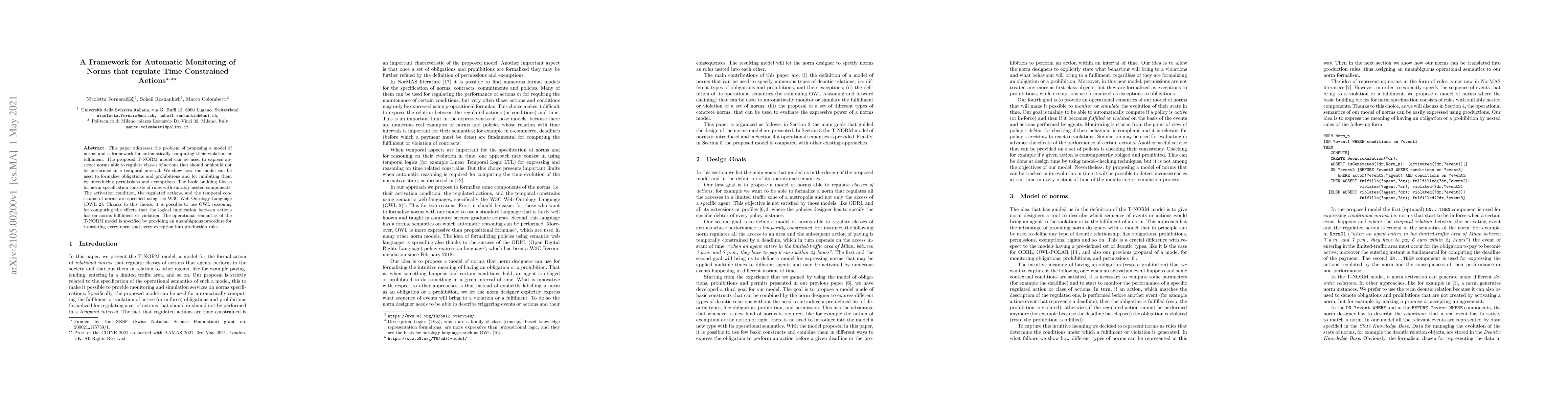 This paper addresses the problem of proposing a model of norms and a framework for automatically computing their violation or fulfilment. The proposed T-NORM model can be used to express abstract norms able to regulate classes of actions that should or should not be performed in a temporal interval. We show how the model can be used to formalize obligations and prohibitions and for inhibiting them by introducing permissions and exemptions. The basic building blocks for norm specification consists of rules with suitably nested components. The activation condition, the regulated actions, and the temporal constrains of norms are specified using the W3C Web Ontology Language (OWL 2). Thanks to this choice, it is possible to use OWL reasoning for computing the effects that the logical implication between actions has on norms fulfilment or violation. The operational semantics of the T-NORM model is specified by providing an unambiguous procedure for translating every norm and every exception into production rules.