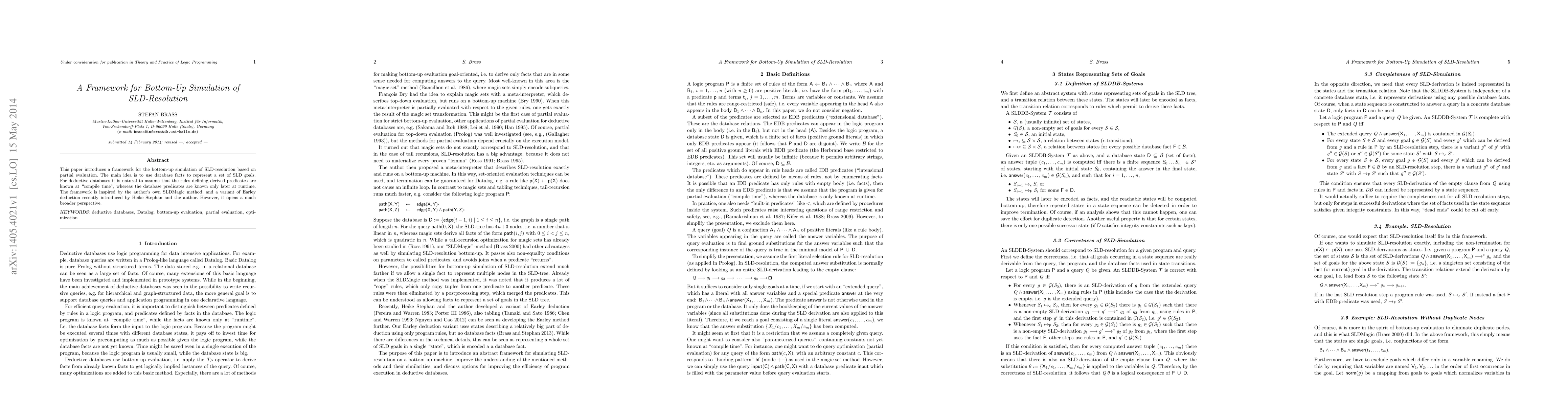 This paper presents a framework for simulating SLD-resolution from a bottom-up approach using partial evaluation, leveraging database facts to represent SLD goals. It extends the SLDMagic method and a variant of Earley deduction, offering a broader perspective on deductive database rule processing.