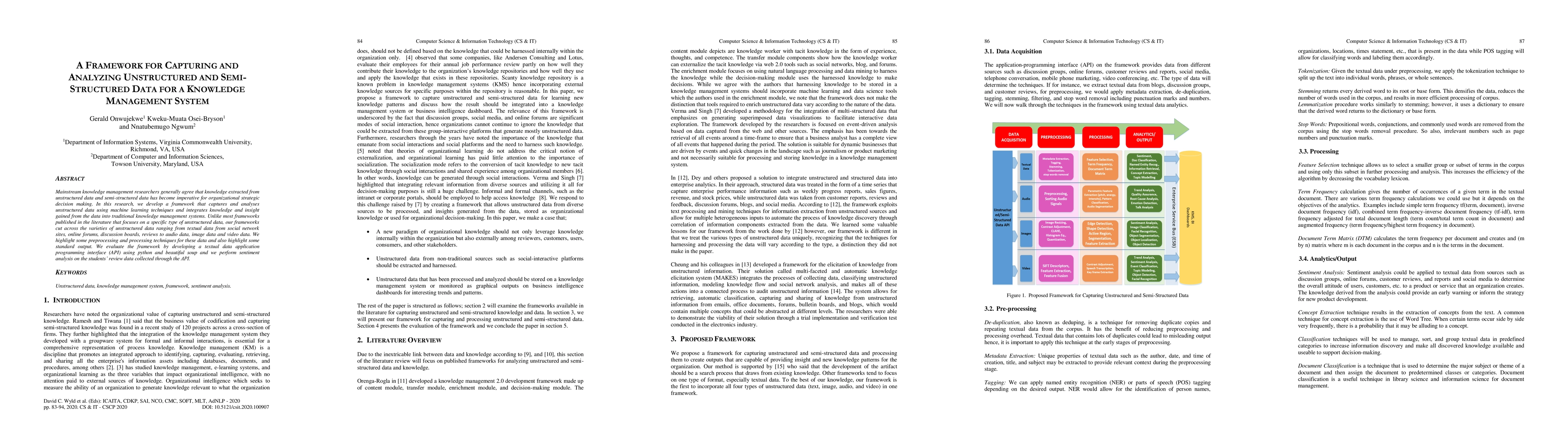 Mainstream knowledge management researchers generally agree that knowledge extracted from unstructured data and semi-structured data have become imperative for organizational strategic decision making. In this research, we develop a framework that captures and analyses unstructured data using machine learning techniques and integrates knowledge and insight gained from the data into traditional knowledge management systems. Unlike most frameworks published in the literature that focuses on a specific type of unstructured data, our frameworks cut across the varieties of unstructured data ranging from textual data from social network sites, online forums, discussion boards, reviews to audio data, image data and video data. We highlight some pre-processing and processing techniques for these data and also highlight some standard output. We evaluate the framework by developing a textual data application programming interface (API) using python and beautiful soup and we perform sentiment analysis on the students review data collected through the API.