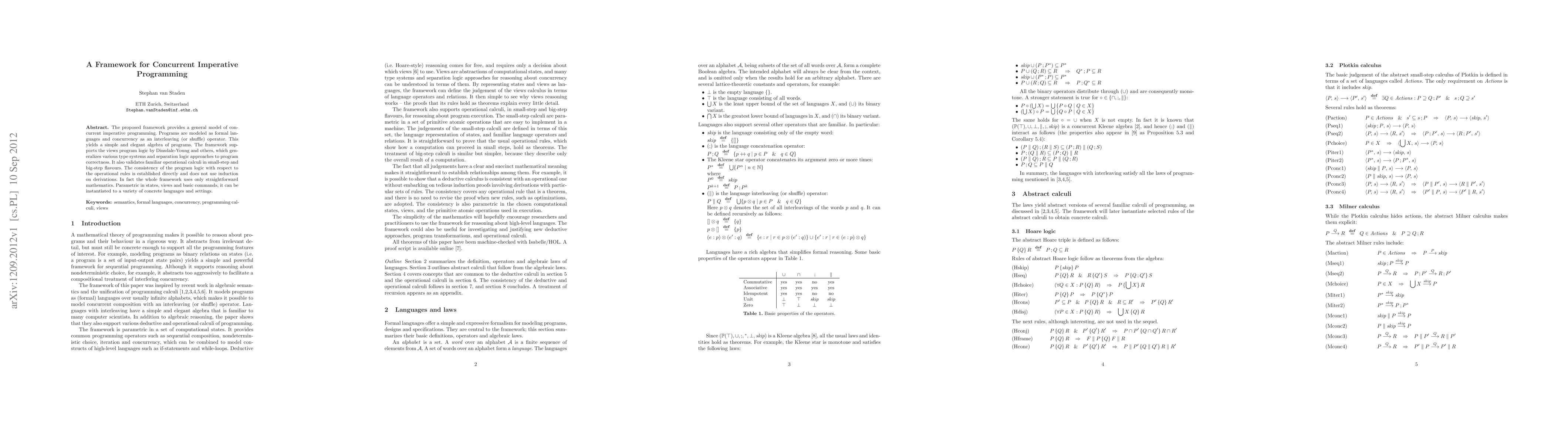The proposed framework provides a general model of concurrent imperative programming. Programs are modeled as formal languages and concurrency as an interleaving (or shuffle) operator. This yields a simple and elegant algebra of programs. The framework supports the views program logic by Dinsdale-Young and others, which generalizes various type systems and separation logic approaches to program correctness. It also validates familiar operational calculi in small-step and big-step flavours. The consistency of the program logic with respect to the operational rules is established directly and does not use induction on derivations. In fact the whole framework uses only straightforward mathematics. Parametric in states, views and basic commands, it can be instantiated to a variety of concrete languages and settings.