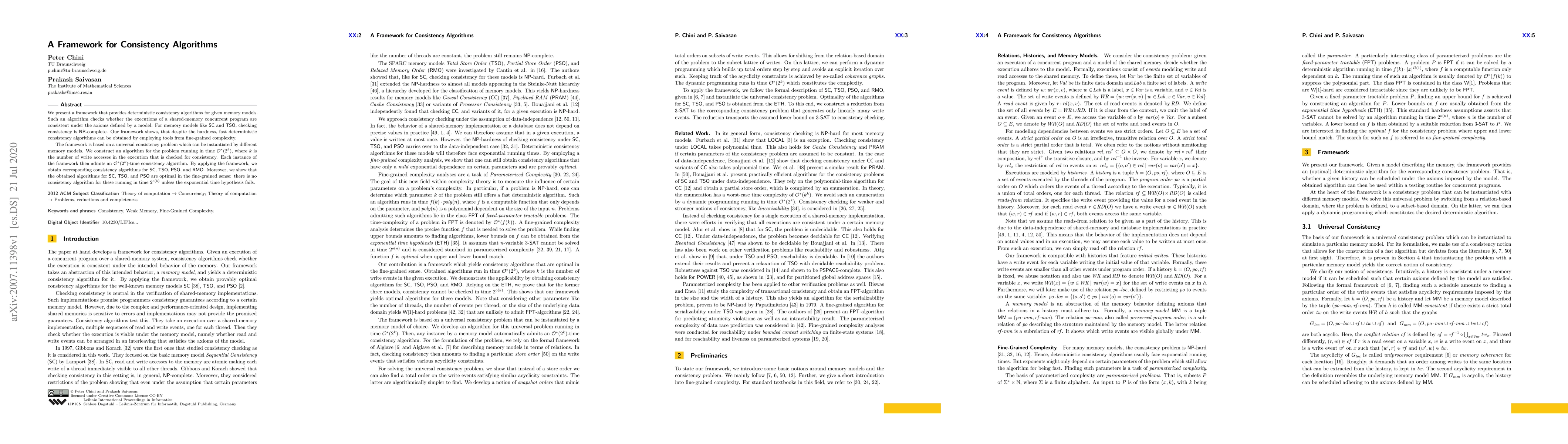 The paper presents a framework for deterministic consistency algorithms, employing fine-grained complexity tools to check consistency for memory models like SC, TSO, PSO, and RMO in O*(2^k) time, where k is the number of write accesses.