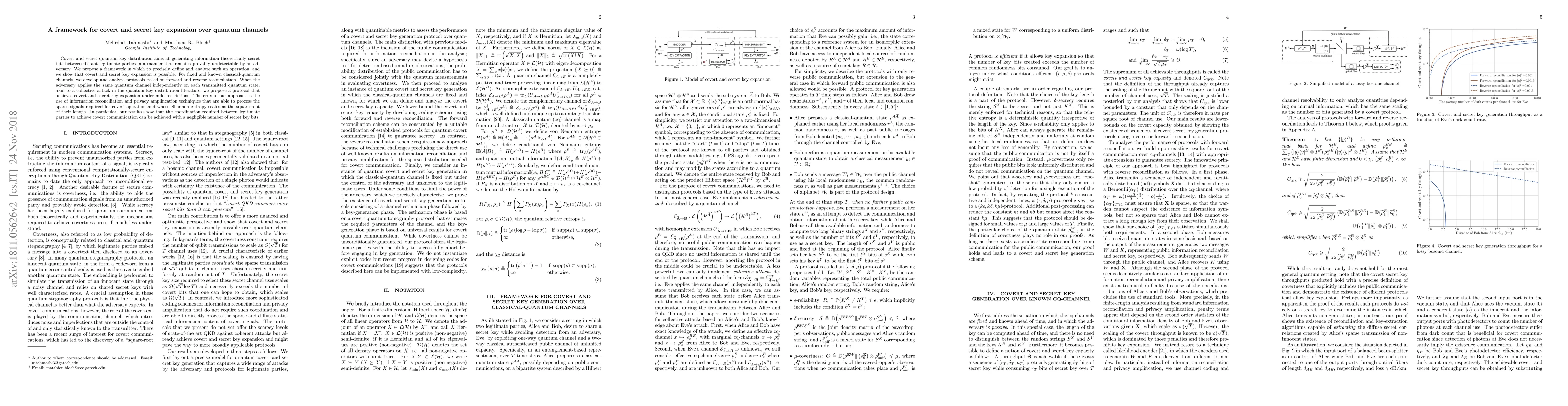 This paper proposes a framework for covert and secret quantum key expansion over quantum channels, demonstrating protocols based on forward and reverse reconciliation that enable information-theoretically secret key generation undetectable by an adversary. The approach leverages information reconciliation and privacy amplification techniques to manage sparse signals, achieving covert communication with minimal coordination and secret key bits.