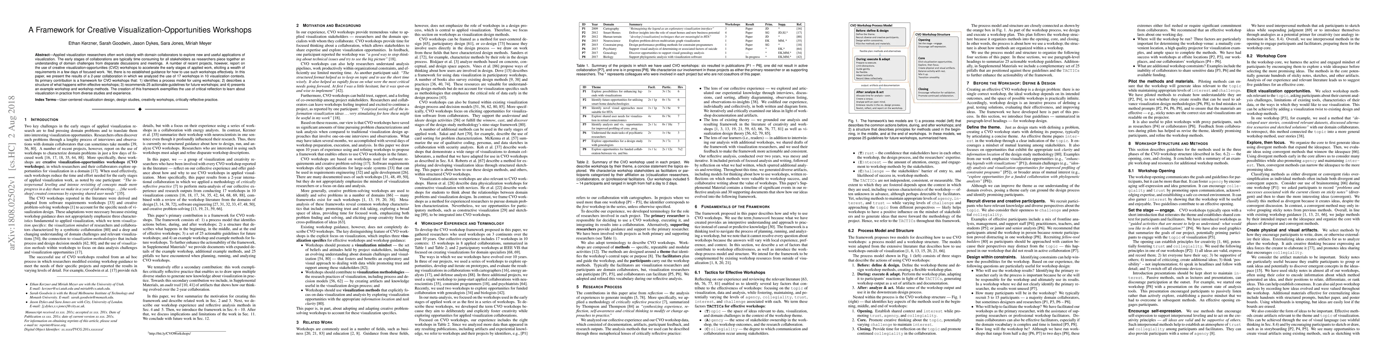 Applied visualization researchers often work closely with domain collaborators to explore new and useful applications of visualization. The early stages of collaborations are typically time consuming for all stakeholders as researchers piece together an understanding of domain challenges from disparate discussions and meetings. A number of recent projects, however, report on the use of creative visualization-opportunities (CVO) workshops to accelerate the early stages of applied work, eliciting a wealth of requirements in a few days of focused work. Yet, there is no established guidance for how to use such workshops effectively. In this paper, we present the results of a 2-year collaboration in which we analyzed the use of 17 workshops in 10 visualization contexts. Its primary contribution is a framework for CVO workshops that: 1) identifies a process model for using workshops; 2) describes a structure of what happens within effective workshops; 3) recommends 25 actionable guidelines for future workshops; and 4) presents an example workshop and workshop methods. The creation of this framework exemplifies the use of critical reflection to learn about visualization in practice from diverse studies and experience.