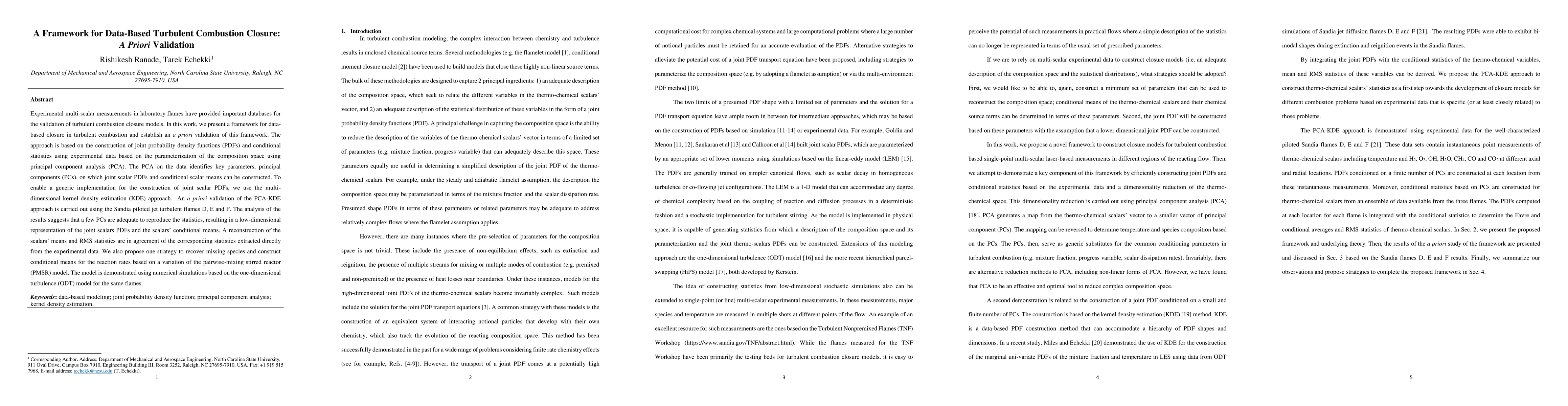 This paper presents a framework for data-based turbulent combustion closure using joint probability density functions and conditional statistics derived from experimental data. The approach employs PCA and multi-dimensional KDE to construct low-dimensional representations of joint scalar PDFs, validated through a priori analysis on Sandia piloted jet flames.