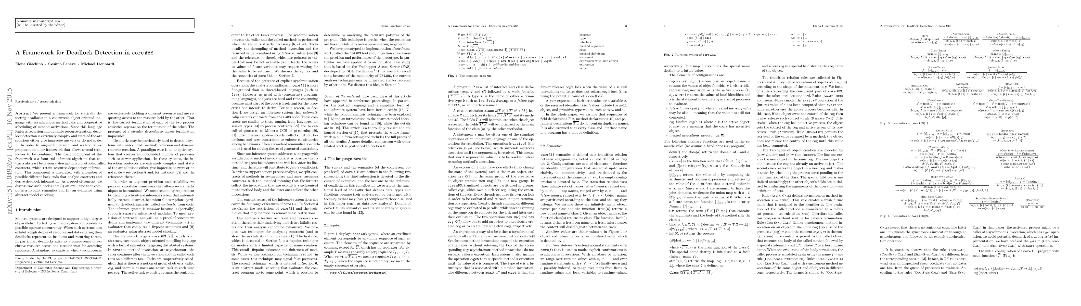 The paper proposes a modular framework for detecting deadlocks in a concurrent object-oriented language featuring asynchronous calls and cooperative scheduling, utilizing a front-end inference algorithm for extracting method contracts and integrating it with backend evaluators for precise and scalable deadlock detection. The framework combines various techniques to address the complexity of recursion and dynamic resource creation.