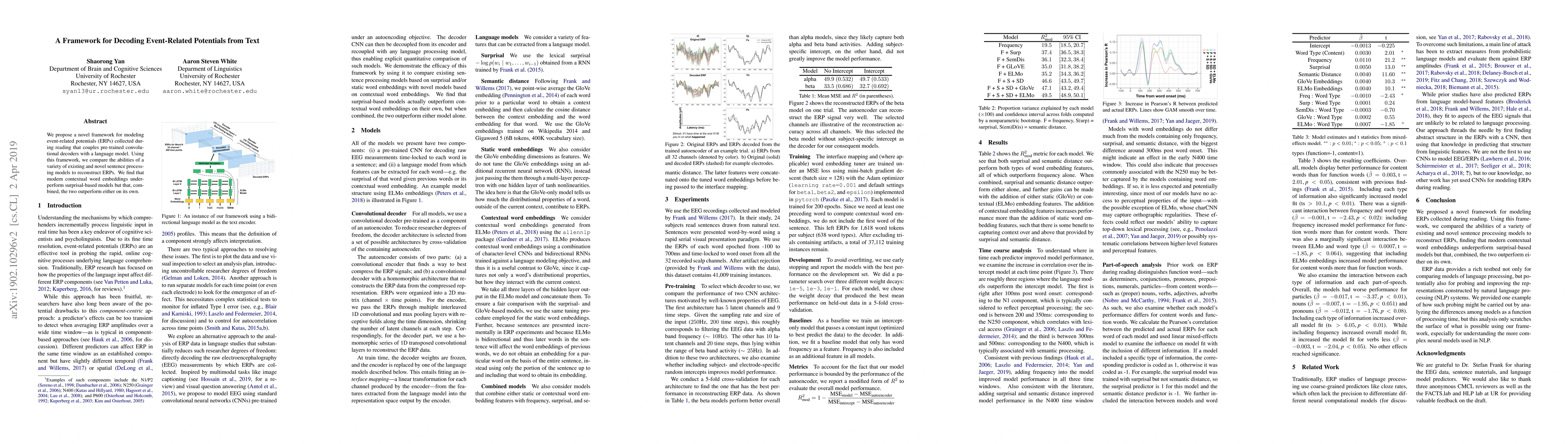 We propose a novel framework for modeling event-related potentials (ERPs) collected during reading that couples pre-trained convolutional decoders with a language model. Using this framework, we compare the abilities of a variety of existing and novel sentence processing models to reconstruct ERPs. We find that modern contextual word embeddings underperform surprisal-based models but that, combined, the two outperform either on its own.