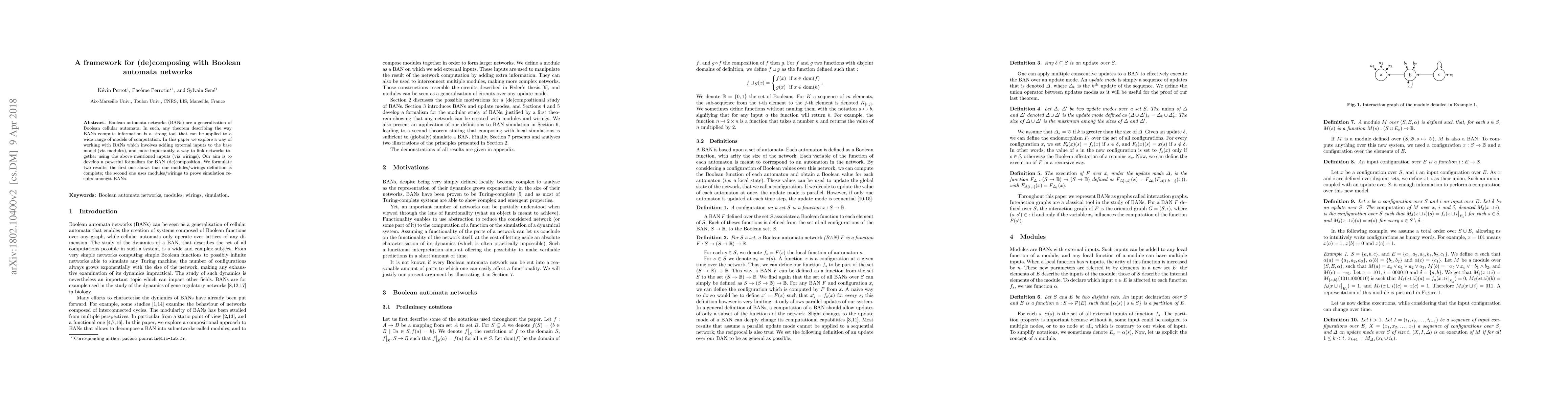 This paper introduces a framework for composing and decomposing Boolean automata networks (BANs) by adding external inputs through modules and linking networks via wirings. The authors demonstrate the completeness of their approach and prove simulation results among BANs using this formalism.