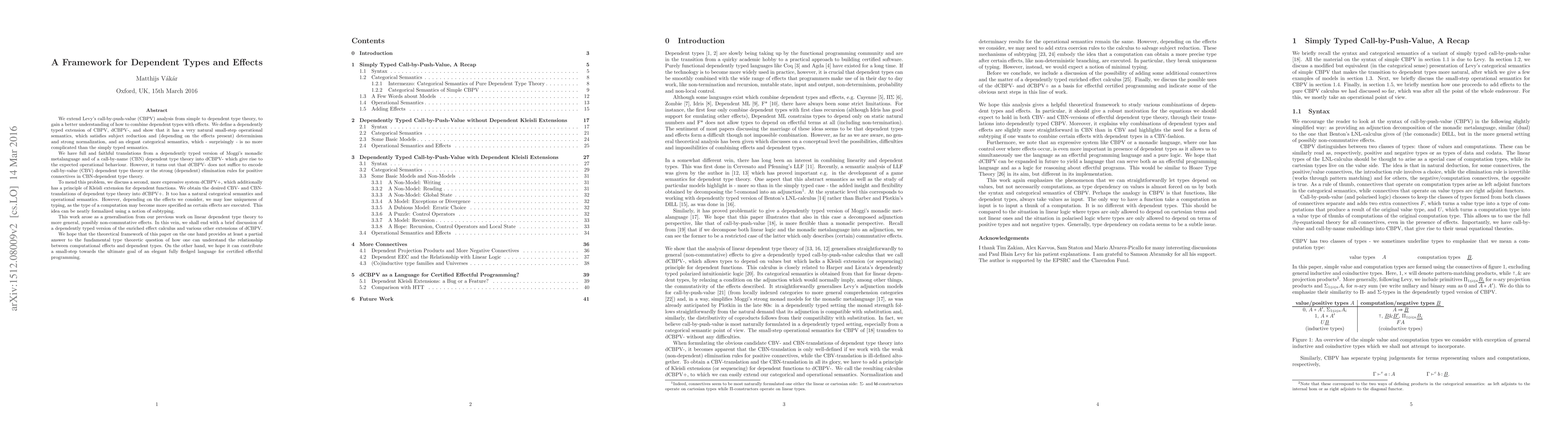 We generalise Levy's call-by-push-value (CBPV) to dependent type theory, to gain a better understanding of how to combine dependent types with effects. We define a dependently typed extension of CBPV, dCBPV-, and show that it has a very natural small-step operational semantics, which satisfies subject reduction and (depending on the effects present) determinism and strong normalization, and an elegant categorical semantics, which - surprisingly - is no more complicated than the simply typed semantics. We have full and faithful translations from a dependently typed version of Moggi's monadic metalanguage and of a call-by-name (CBN) dependent type theory into dCBPV- which give rise to the expected operational behaviour. However, it turns out that dCBPV- does not suffice to encode call-by-value (CBV) dependent type theory or the strong (dependent) elimination rules for positive connectives in CBN-dependent type theory. To mend this problem, we discuss a second, more expressive system dCBPV+, which additionally has a principle of Kleisli extension for dependent functions. We obtain the desired CBV- and CBN-translations of dependent type theory into dCBPV+. It too has a natural categorical semantics and operational semantics. However, depending on the effects we consider, we may lose uniqueness of typing, as the type of a computation may become more specified as certain effects are executed. This idea can be neatly formalized using a notion of subtyping. We hope that the theoretical framework of this paper on the one hand provides at least a partial answer to the fundamental type theoretic question of how one can understand the relationship between computational effects and dependent types. On the other hand, we hope it can contribute a small-step towards the ultimate goal of an elegant fully fledged language for certified effectful programming.