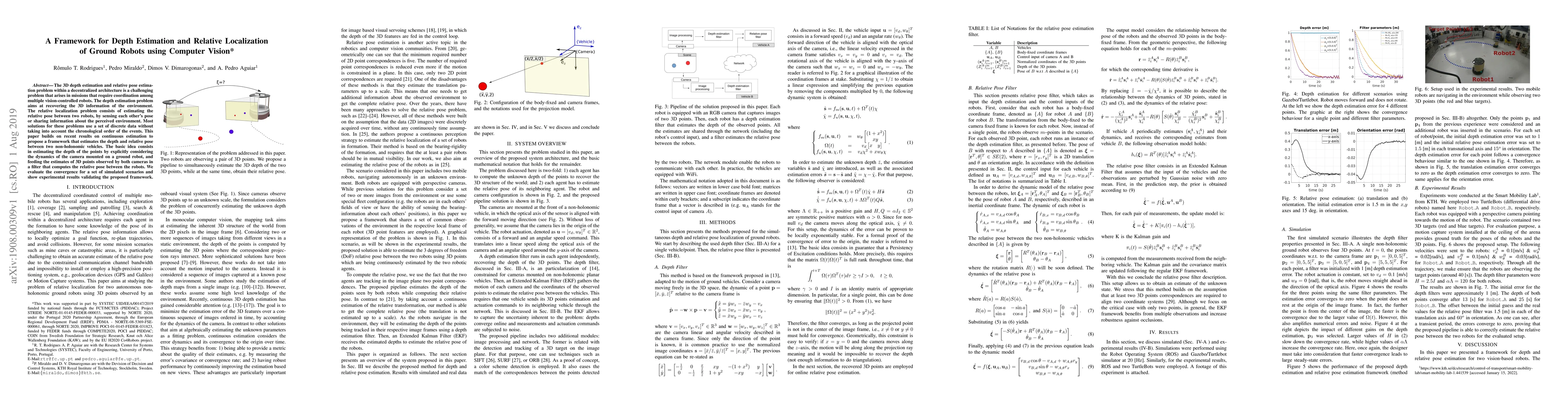 The 3D depth estimation and relative pose estimation problem within a decentralized architecture is a challenging problem that arises in missions that require coordination among multiple vision-controlled robots. The depth estimation problem aims at recovering the 3D information of the environment. The relative localization problem consists of estimating the relative pose between two robots, by sensing each other's pose or sharing information about the perceived environment. Most solutions for these problems use a set of discrete data without taking into account the chronological order of the events. This paper builds on recent results on continuous estimation to propose a framework that estimates the depth and relative pose between two non-holonomic vehicles. The basic idea consists in estimating the depth of the points by explicitly considering the dynamics of the camera mounted on a ground robot, and feeding the estimates of 3D points observed by both cameras in a filter that computes the relative pose between the robots. We evaluate the convergence for a set of simulated scenarios and show experimental results validating the proposed framework.