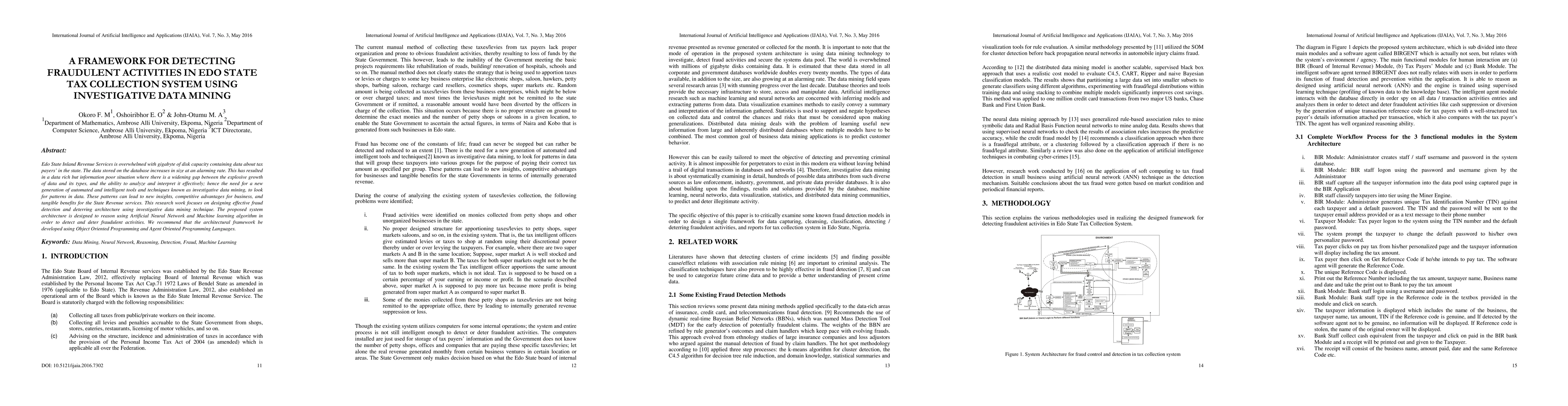 The research proposes a framework for detecting fraudulent activities in Edo State's tax collection system using investigative data mining techniques, including Artificial Neural Networks and Machine Learning algorithms. The system architecture consists of three main modules (BIR, Tax Payers', and Bank) and an intelligent software agent (BIRGENT) for fraud detection and prevention.