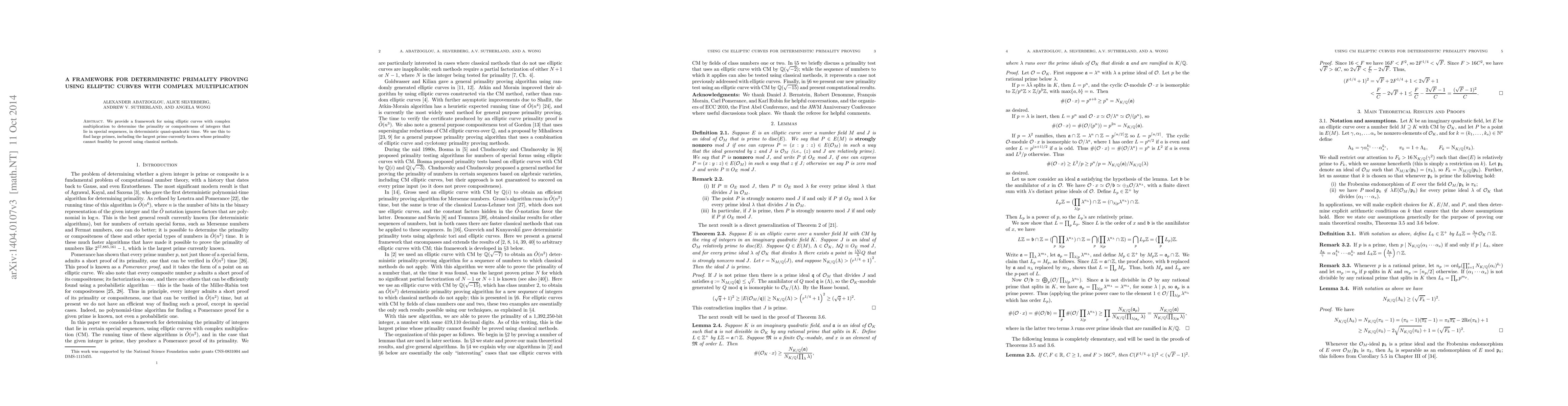 This paper introduces a deterministic framework for primality proving of integers using elliptic curves with complex multiplication, achieving quasi-quadratic time complexity. It also demonstrates its application in finding large primes, including the largest prime whose primality cannot be proven by classical methods.