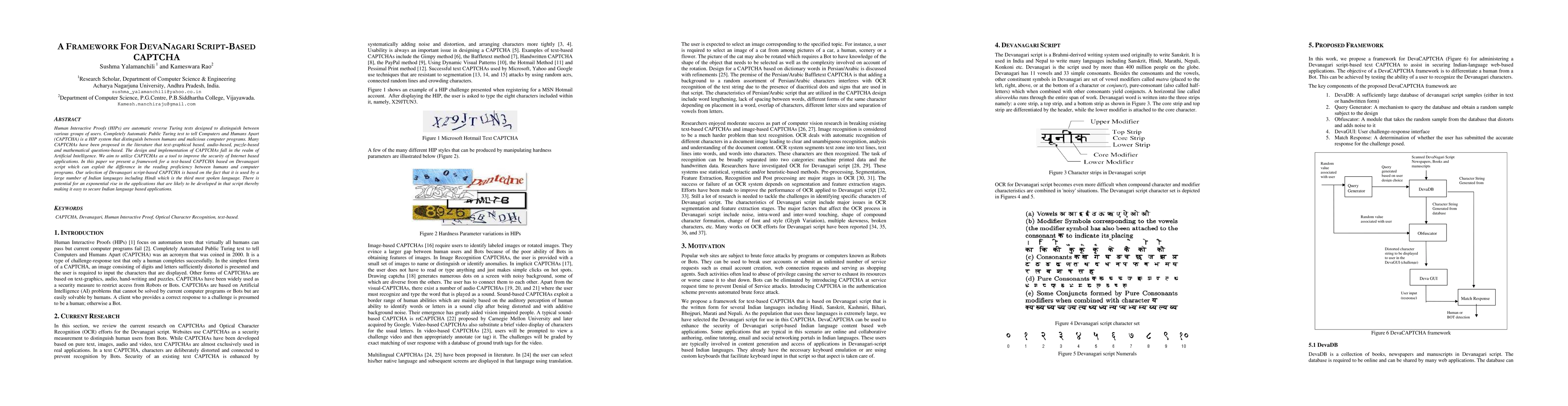 This paper proposes a framework for a Devanagari script-based CAPTCHA to distinguish humans from malicious computer programs, leveraging the script's complexity and the varying reading proficiency between humans and machines. The framework aims to enhance the security of Indian language-based internet applications.