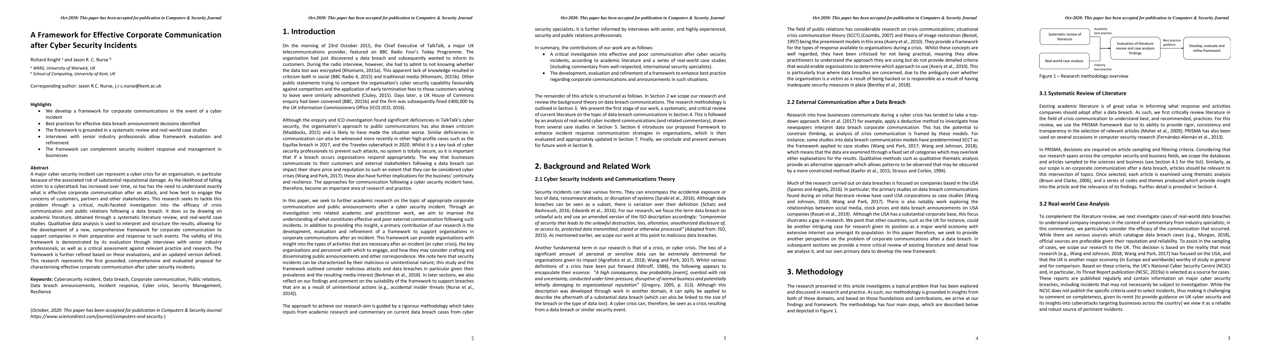 A major cyber security incident can represent a cyber crisis for an organisation, in particular because of the associated risk of substantial reputational damage. As the likelihood of falling victim to a cyberattack has increased over time, so too has the need to understand exactly what is effective corporate communication after an attack, and how best to engage the concerns of customers, partners and other stakeholders. This research seeks to tackle this problem through a critical, multi-faceted investigation into the efficacy of crisis communication and public relations following a data breach. It does so by drawing on academic literature, obtained through a systematic literature review, and real-world case studies. Qualitative data analysis is used to interpret and structure the results, allowing for the development of a new, comprehensive framework for corporate communication to support companies in their preparation and response to such events. The validity of this framework is demonstrated by its evaluation through interviews with senior industry professionals, as well as a critical assessment against relevant practice and research. The framework is further refined based on these evaluations, and an updated version defined. This research represents the first grounded, comprehensive and evaluated proposal for characterising effective corporate communication after cyber security incidents.
