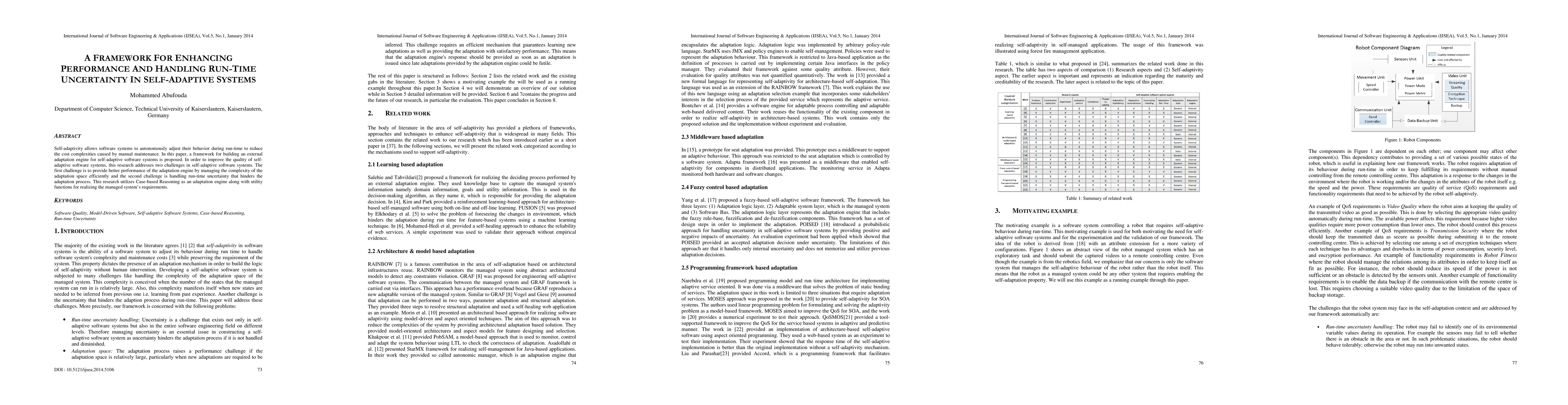 This paper proposes a framework for an external adaptation engine to enhance performance and manage run-time uncertainty in self-adaptive software systems. It addresses performance improvement through efficient adaptation space complexity management and tackles run-time uncertainty using Case-based Reasoning and utility functions.