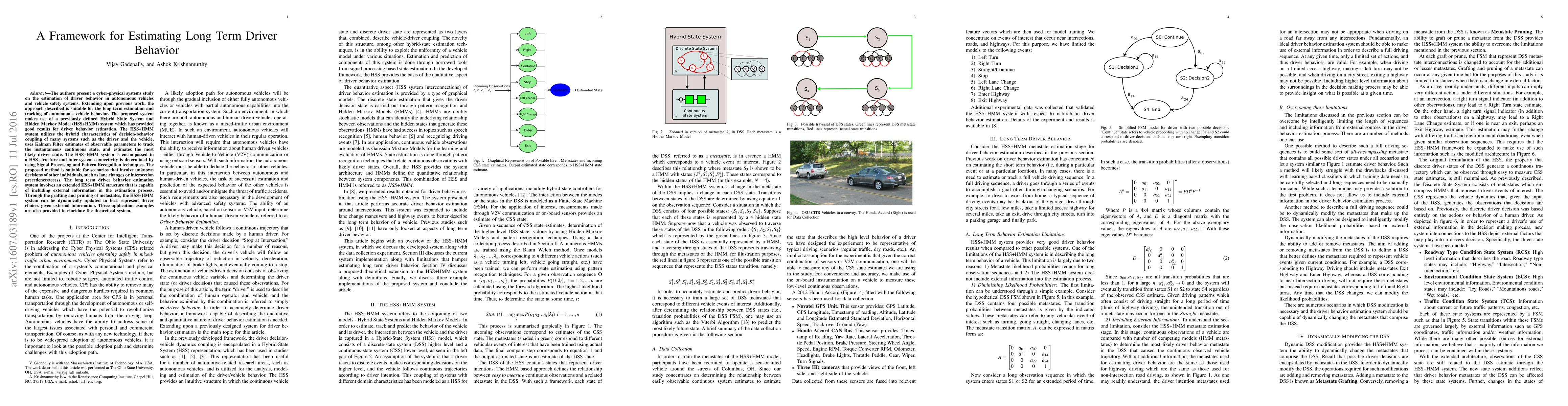 This paper proposes a framework using a Hybrid State System and Hidden Markov Model (HSS+HMM) to estimate long-term driver behavior in autonomous vehicles, employing Kalman Filters for state tracking and Signal Processing for inter-system connectivity. The system dynamically updates through metastate grafting and pruning to adapt to external factors.