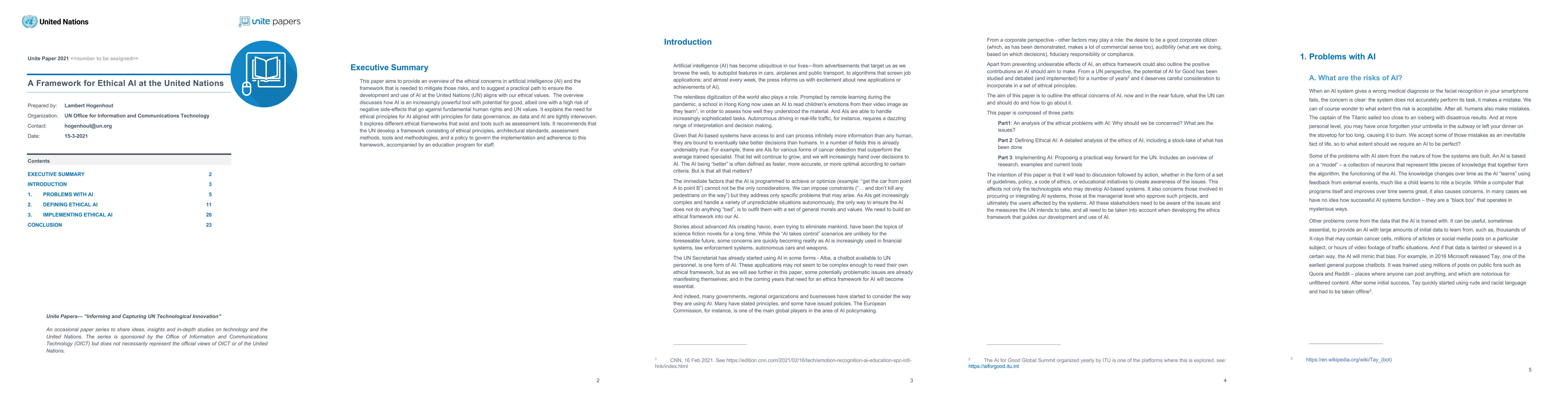 This paper outlines ethical concerns surrounding AI and proposes a framework for the UN to mitigate risks, ensuring AI development aligns with ethical values and human rights. It recommends a comprehensive approach including ethical principles, architectural standards, assessment tools, and an education program for staff.