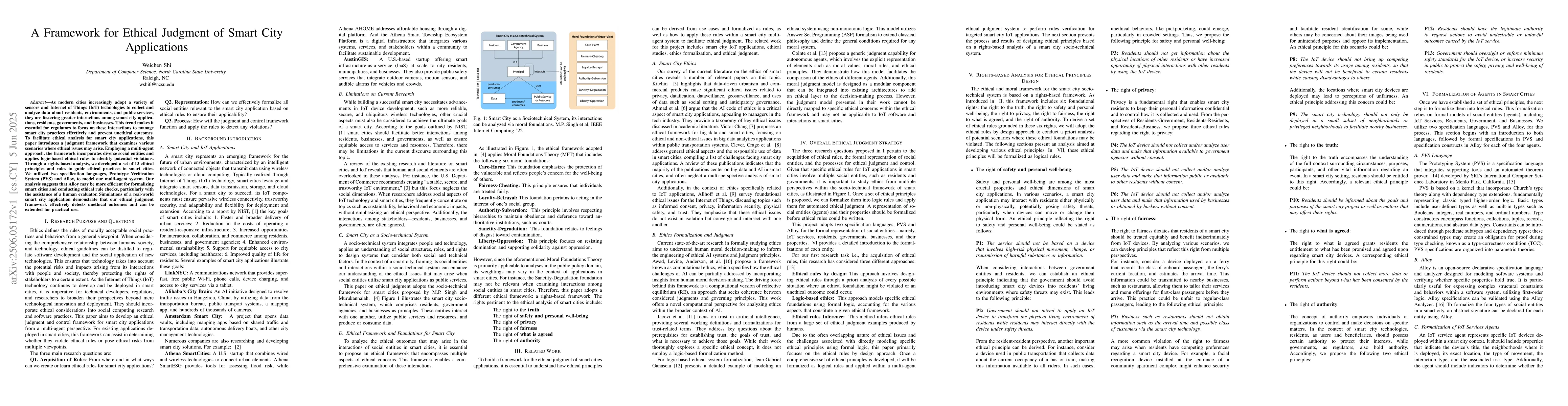 The paper presents a formalized multi-agent system for ethical judgment of smart city applications, incorporating logic-based ethical rules and using PVS and Alloy for specification.