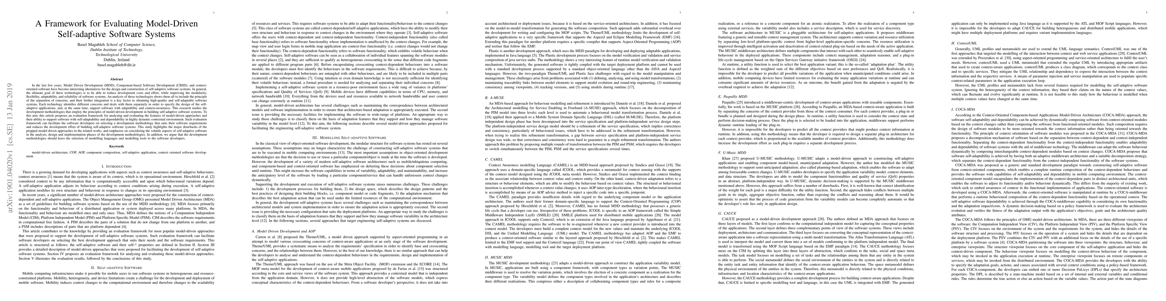 This paper proposes a framework for evaluating model-driven approaches to developing self-adaptive software systems, emphasizing the importance of separation of concerns and adaptability in dynamic contexts. It highlights the drawbacks of existing methodologies and suggests developers should choose their modelling languages and tools.