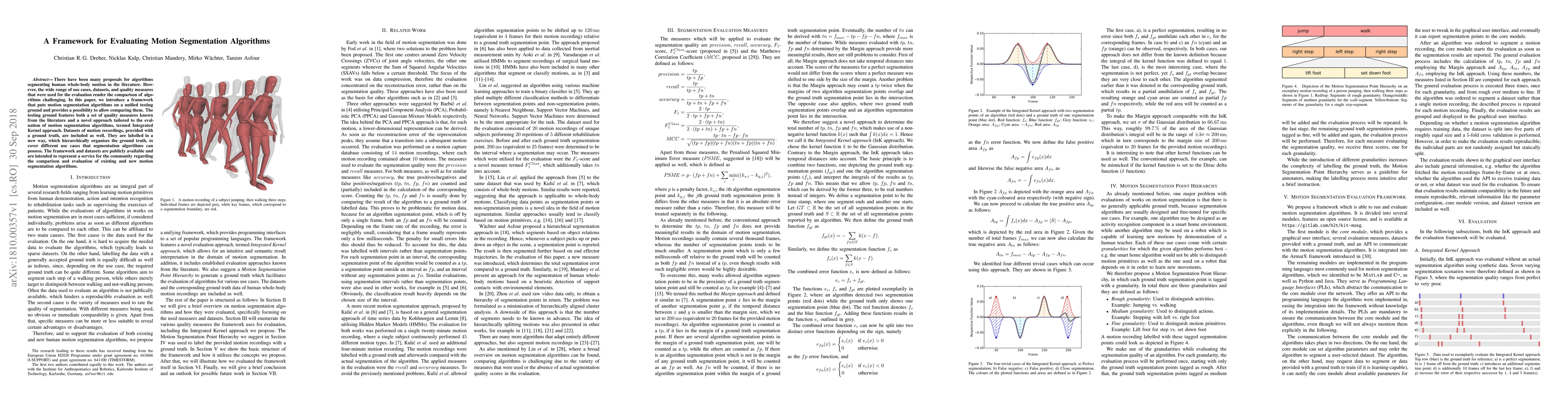 There have been many proposals for algorithms segmenting human whole-body motion in the literature. However, the wide range of use cases, datasets, and quality measures that were used for the evaluation render the comparison of algorithms challenging. In this paper, we introduce a framework that puts motion segmentation algorithms on a unified testing ground and provides a possibility to allow comparing them. The testing ground features both a set of quality measures known from the literature and a novel approach tailored to the evaluation of motion segmentation algorithms, termed Integrated Kernel approach. Datasets of motion recordings, provided with a ground truth, are included as well. They are labelled in a new way, which hierarchically organises the ground truth, to cover different use cases that segmentation algorithms can possess. The framework and datasets are publicly available and are intended to represent a service for the community regarding the comparison and evaluation of existing and new motion segmentation algorithms.