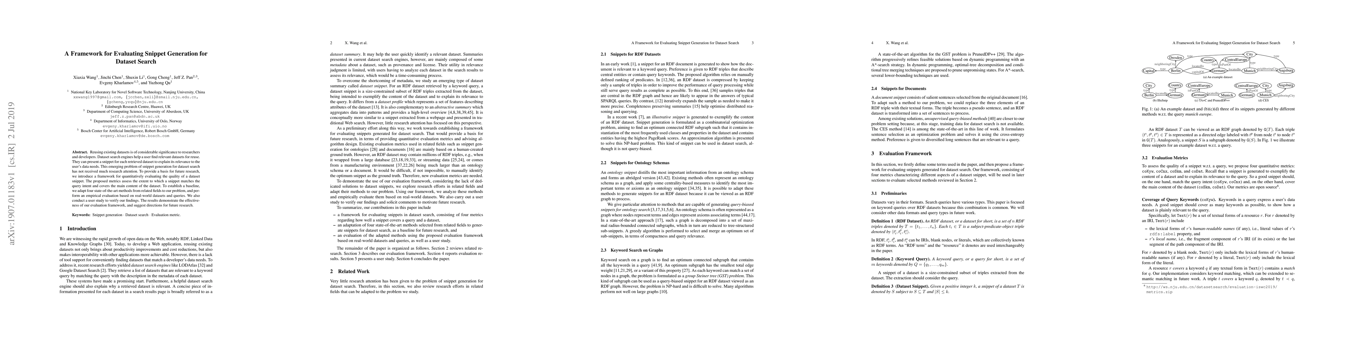 This paper introduces a framework for quantitatively evaluating the quality of snippets generated for dataset search engines, focusing on how well they match user queries and dataset content. The study adapts four existing methods, conducts empirical evaluation, and verifies results through a user study, showing the framework's effectiveness and guiding future research.