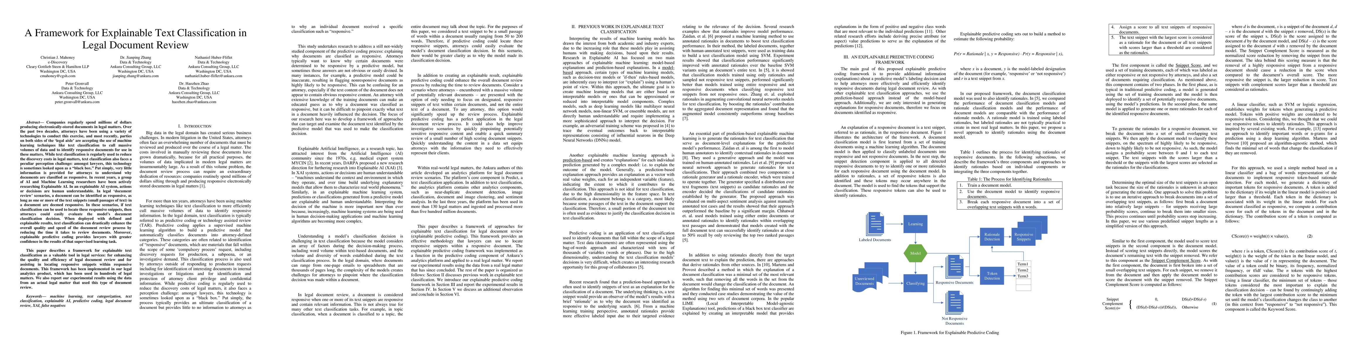 Companies regularly spend millions of dollars producing electronically-stored documents in legal matters. Recently, parties on both sides of the 'legal aisle' are accepting the use of machine learning techniques like text classification to cull massive volumes of data and to identify responsive documents for use in these matters. While text classification is regularly used to reduce the discovery costs in legal matters, it also faces a peculiar perception challenge: amongst lawyers, this technology is sometimes looked upon as a "black box", little information provided for attorneys to understand why documents are classified as responsive. In recent years, a group of AI and ML researchers have been actively researching Explainable AI, in which actions or decisions are human understandable. In legal document review scenarios, a document can be identified as responsive, if one or more of its text snippets are deemed responsive. In these scenarios, if text classification can be used to locate these snippets, then attorneys could easily evaluate the model's classification decision. When deployed with defined and explainable results, text classification can drastically enhance overall quality and speed of the review process by reducing the review time. Moreover, explainable predictive coding provides lawyers with greater confidence in the results of that supervised learning task. This paper describes a framework for explainable text classification as a valuable tool in legal services: for enhancing the quality and efficiency of legal document review and for assisting in locating responsive snippets within responsive documents. This framework has been implemented in our legal analytics product, which has been used in hundreds of legal matters. We also report our experimental results using the data from an actual legal matter that used this type of document review.