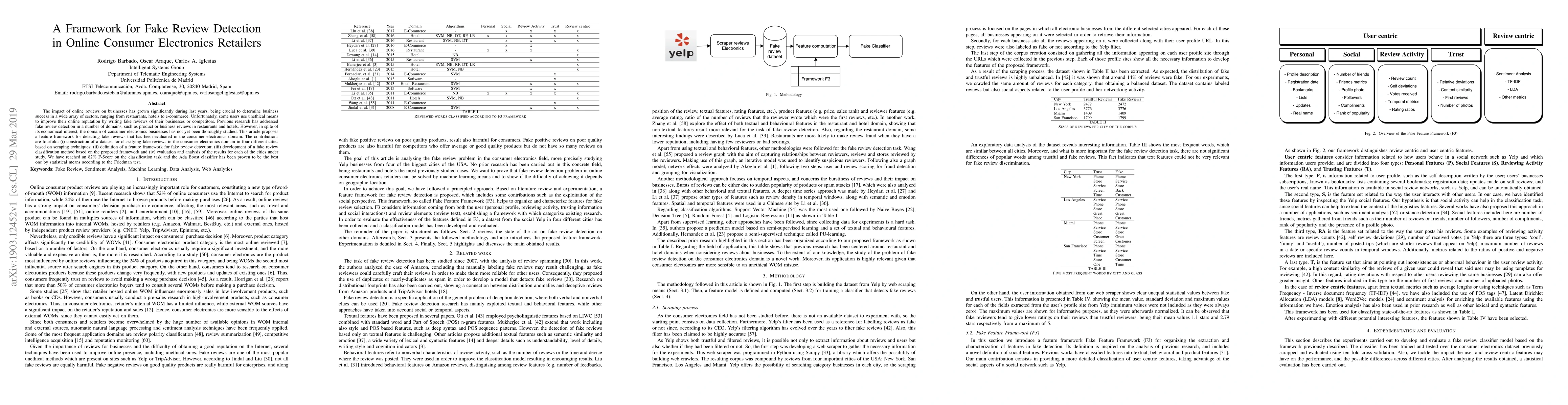 This paper proposes a framework for detecting fake reviews in online consumer electronics retailers, including a dataset construction, feature framework definition, and classification method development. The best performing Ada Boost classifier achieved an 82% F-Score in the classification task.