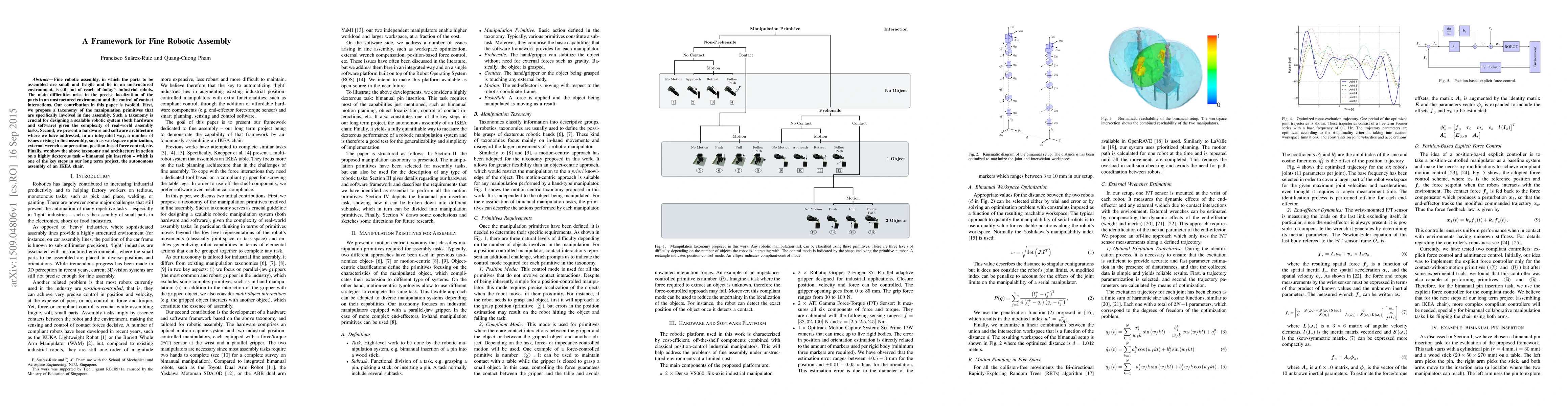 This paper proposes a taxonomy of manipulation primitives for fine robotic assembly and presents a comprehensive hardware and software architecture addressing challenges like localization, control, and workspace optimization. The framework is demonstrated through a bimanual pin insertion task for autonomous assembly of an IKEA chair.