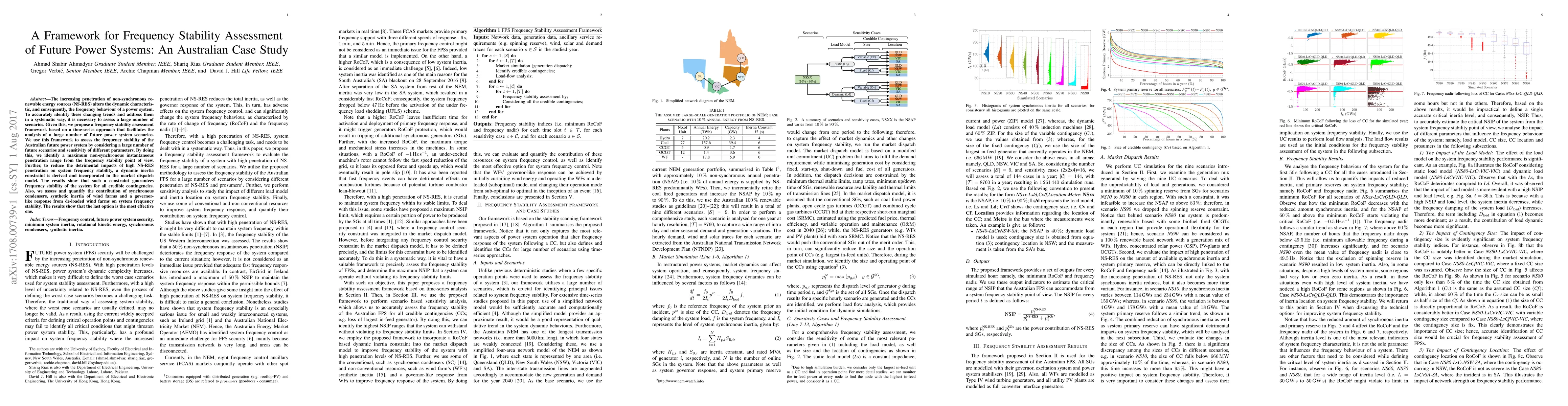 This paper proposes a framework for assessing frequency stability in future power systems with high non-synchronous renewable energy source penetration, using Australian scenarios. The study identifies optimal penetration limits and introduces a dynamic inertia constraint to maintain stability, finding that de-loaded wind farms' governor-like response is most effective.