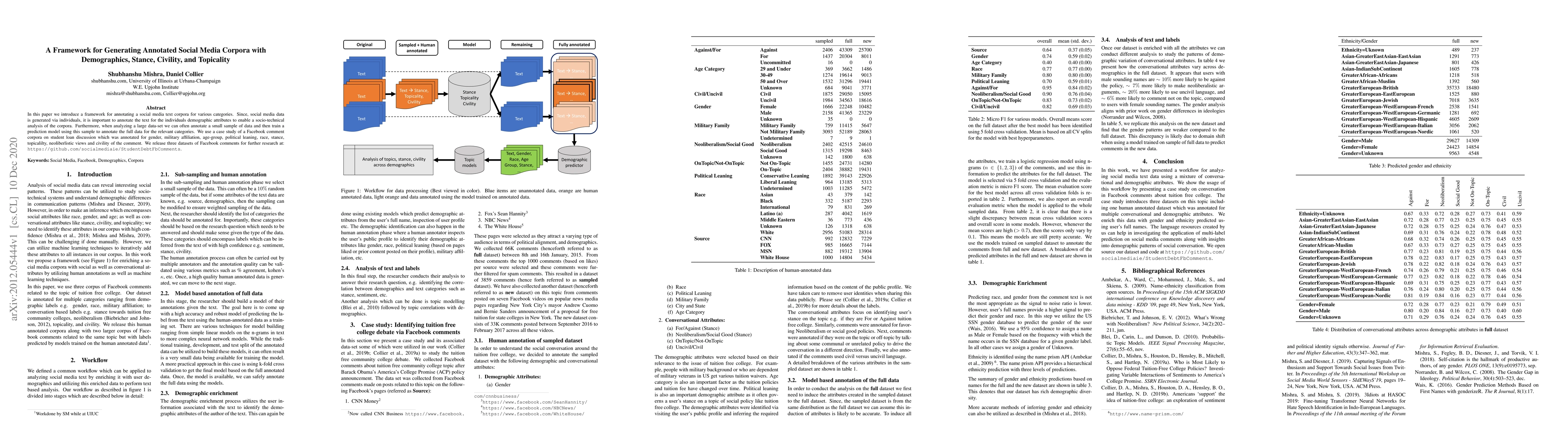 A framework is introduced for annotating social media corpora with demographic information, stance, civility, and topicality to enable socio-technical analysis. Annotated datasets of Facebook comments on student loan discussions are released for further research.