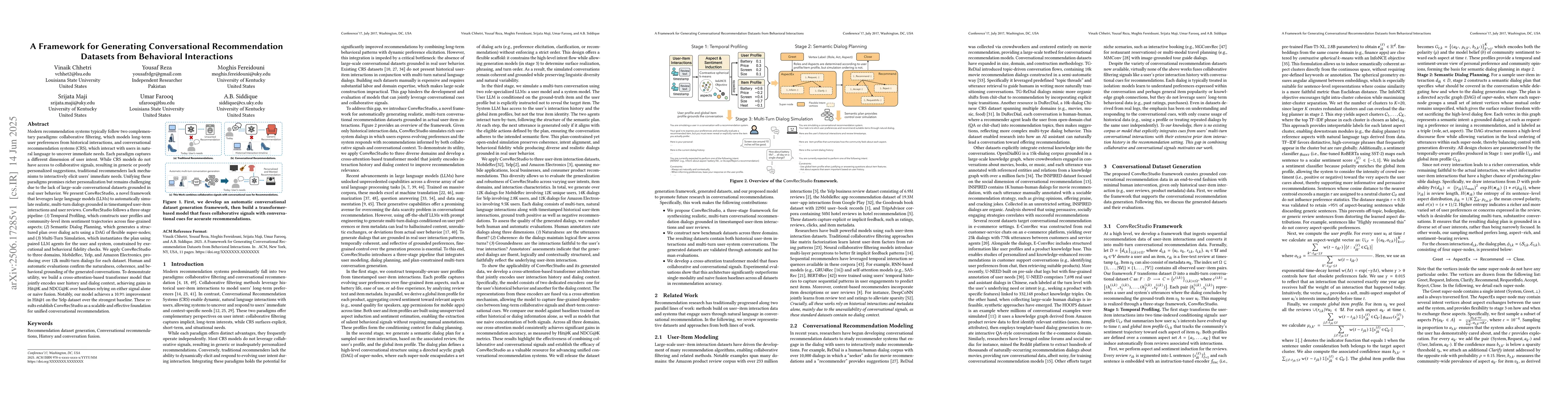 The paper presents ConvRecStudio, a framework that generates conversational recommendation datasets from behavioral interactions using large language models (LLMs). It follows a three-stage pipeline: Temporal Profiling, Semantic Dialog Planning, and Multi-Turn Simulation.