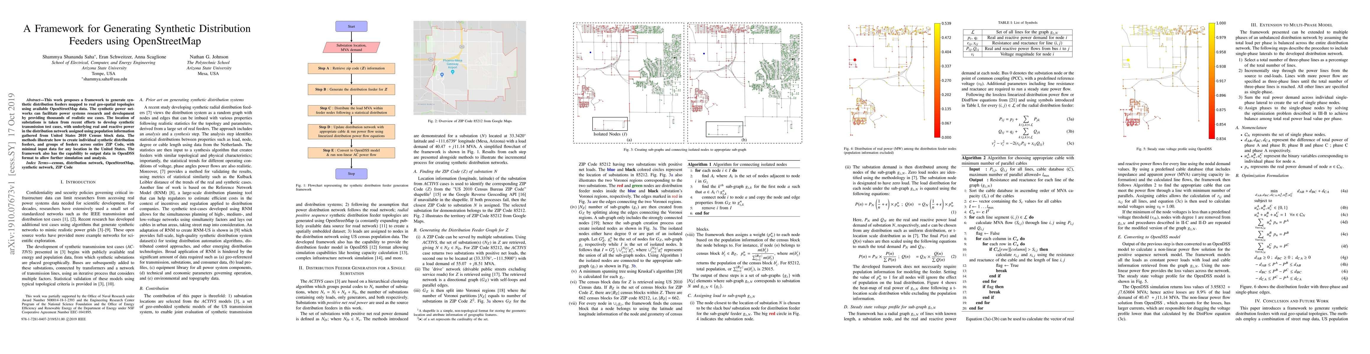 This paper presents a framework for creating synthetic distribution feeders based on OpenStreetMap data, enabling extensive power systems research with realistic use cases. It uses substation locations from synthetic transmission test cases and population data from the 2010 U.S. Census to assign real and reactive power, with outputs in \OpenDSS format for simulation.