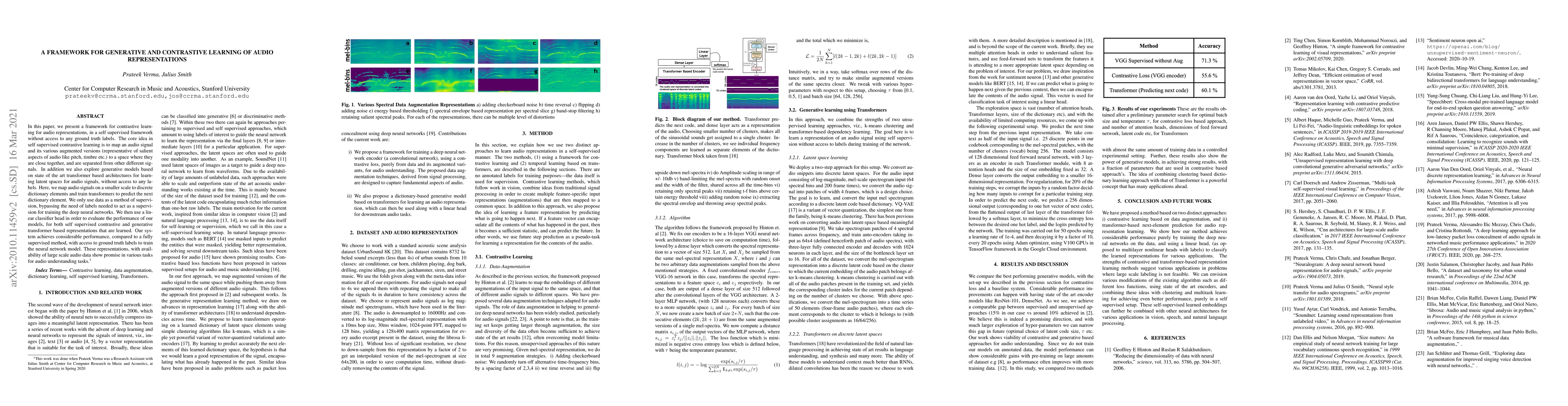 In this paper, we present a framework for contrastive learning for audio representations, in a self supervised frame work without access to any ground truth labels. The core idea in self supervised contrastive learning is to map an audio signal and its various augmented versions (representative of salient aspects of audio like pitch, timbre etc.) to a space where they are close together, and are separated from other different signals. In addition we also explore generative models based on state of the art transformer based architectures for learning latent spaces for audio signals, without access to any labels. Here, we map audio signals on a smaller scale to discrete dictionary elements and train transformers to predict the next dictionary element. We only use data as a method of supervision, bypassing the need of labels needed to act as a supervision for training the deep neural networks. We then use a linear classifier head in order to evaluate the performance of our models, for both self supervised contrastive and generative transformer based representations that are learned. Our system achieves considerable performance, compared to a fully supervised method, with access to ground truth labels to train the neural network model. These representations, with avail-ability of large scale audio data show promise in various tasks for audio understanding tasks