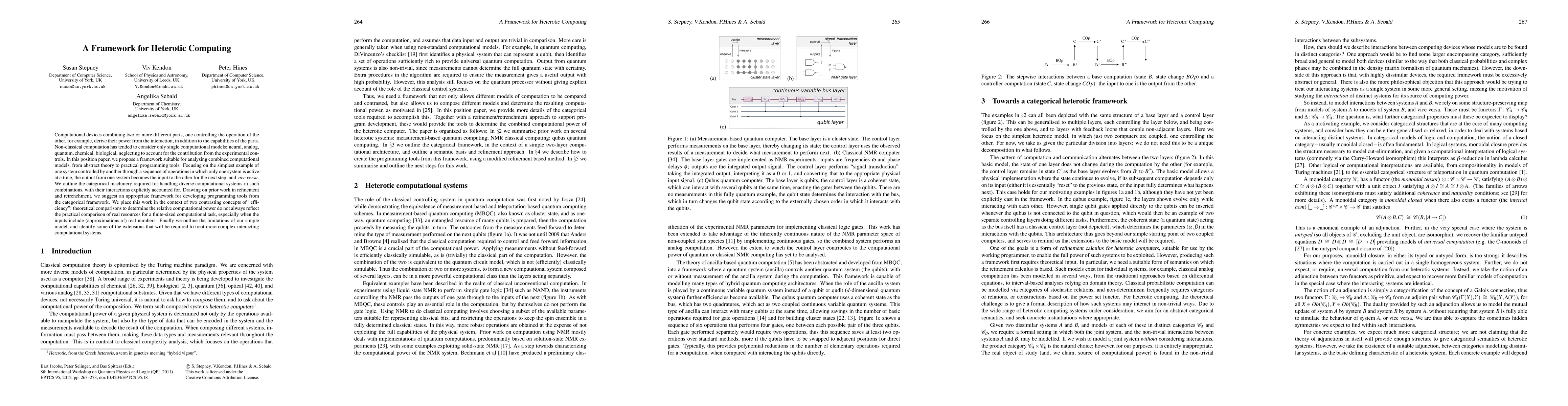 Computational devices combining two or more different parts, one controlling the operation of the other, for example, derive their power from the interaction, in addition to the capabilities of the parts. Non-classical computation has tended to consider only single computational models: neural, analog, quantum, chemical, biological, neglecting to account for the contribution from the experimental controls. In this position paper, we propose a framework suitable for analysing combined computational models, from abstract theory to practical programming tools. Focusing on the simplest example of one system controlled by another through a sequence of operations in which only one system is active at a time, the output from one system becomes the input to the other for the next step, and vice versa. We outline the categorical machinery required for handling diverse computational systems in such combinations, with their interactions explicitly accounted for. Drawing on prior work in refinement and retrenchment, we suggest an appropriate framework for developing programming tools from the categorical framework. We place this work in the context of two contrasting concepts of "efficiency": theoretical comparisons to determine the relative computational power do not always reflect the practical comparison of real resources for a finite-sized computational task, especially when the inputs include (approximations of) real numbers. Finally we outline the limitations of our simple model, and identify some of the extensions that will be required to treat more complex interacting computational systems.