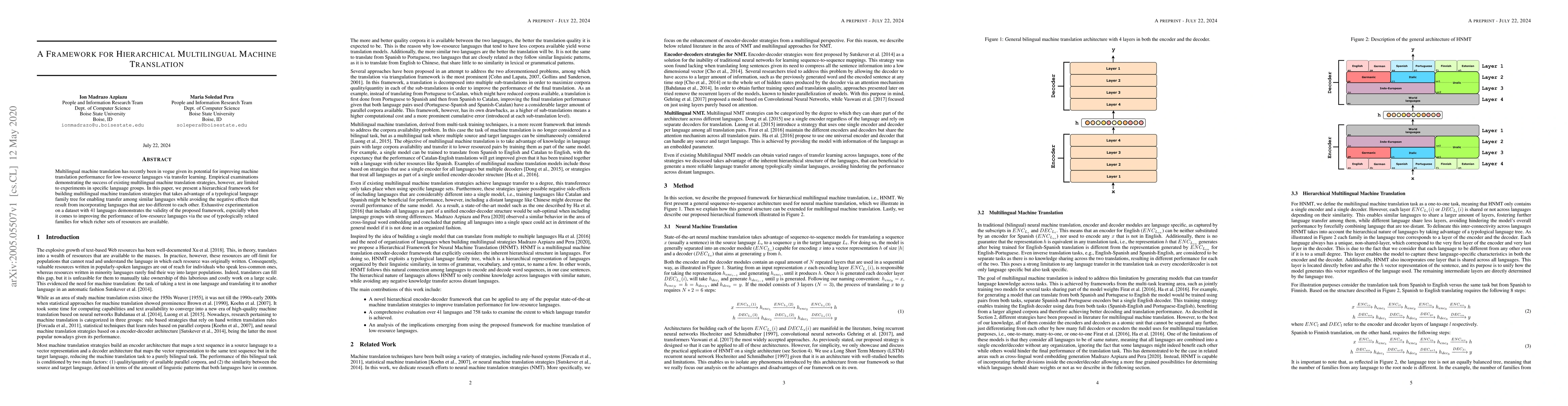 This paper proposes a hierarchical framework for multilingual machine translation that leverages a typological language family tree to facilitate transfer learning among related languages, thereby enhancing performance for low-resource languages. Experiments on a dataset with 41 languages validate the effectiveness of the framework in improving translation quality through strategic language grouping.