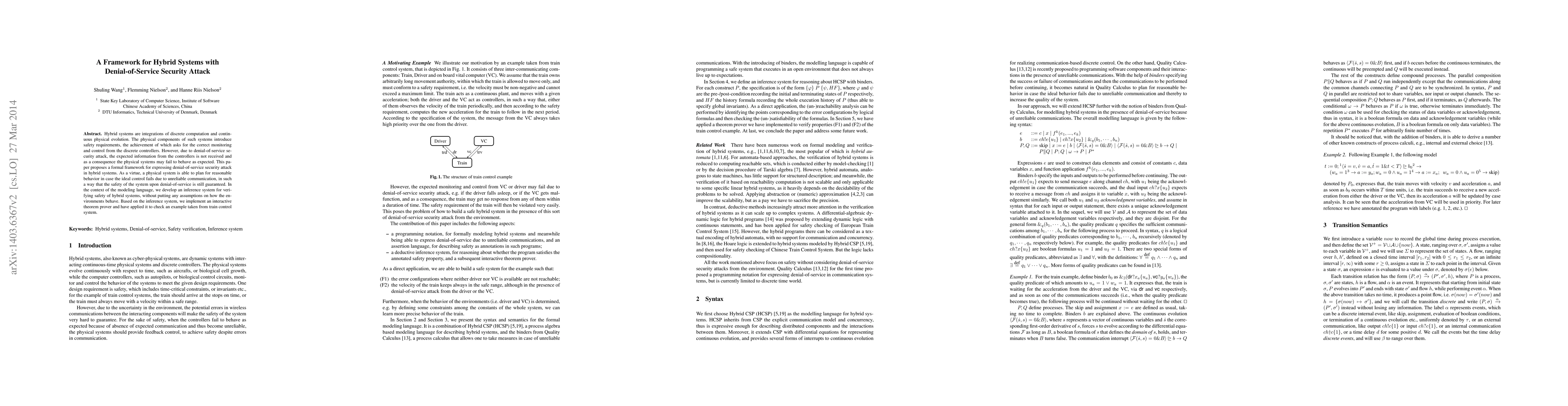 This paper proposes a formal framework to address denial-of-service security attacks in hybrid systems, ensuring safety even when communication failures occur. It introduces an inference system and an interactive theorem prover to verify system safety without assumptions about environmental behavior, demonstrated through a train control example.