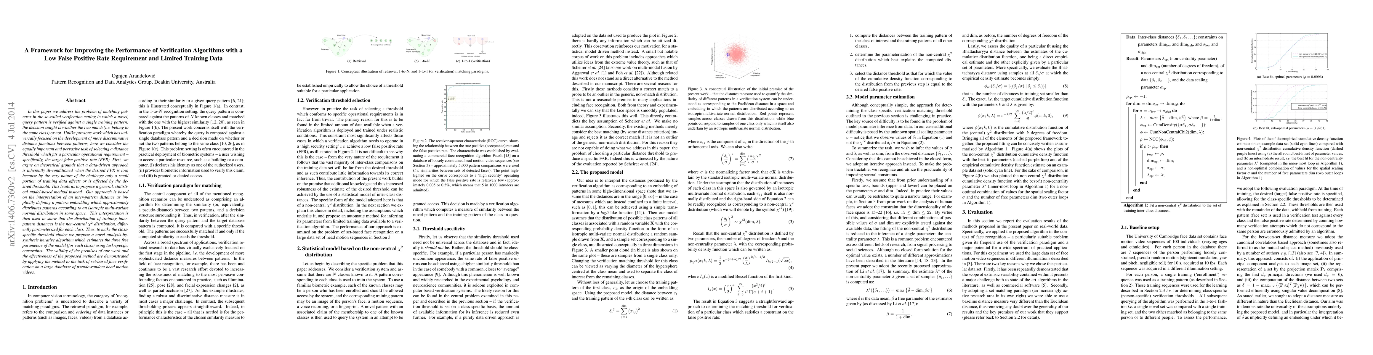 In this paper we address the problem of matching patterns in the so-called verification setting in which a novel, query pattern is verified against a single training pattern: the decision sought is whether the two match (i.e. belong to the same class) or not. Unlike previous work which has universally focused on the development of more discriminative distance functions between patterns, here we consider the equally important and pervasive task of selecting a distance threshold which fits a particular operational requirement - specifically, the target false positive rate (FPR). First, we argue on theoretical grounds that a data-driven approach is inherently ill-conditioned when the desired FPR is low, because by the very nature of the challenge only a small portion of training data affects or is affected by the desired threshold. This leads us to propose a general, statistical model-based method instead. Our approach is based on the interpretation of an inter-pattern distance as implicitly defining a pattern embedding which approximately distributes patterns according to an isotropic multi-variate normal distribution in some space. This interpretation is then used to show that the distribution of training inter-pattern distances is the non-central chi2 distribution, differently parameterized for each class. Thus, to make the class-specific threshold choice we propose a novel analysis-by-synthesis iterative algorithm which estimates the three free parameters of the model (for each class) using task-specific constraints. The validity of the premises of our work and the effectiveness of the proposed method are demonstrated by applying the method to the task of set-based face verification on a large database of pseudo-random head motion videos.