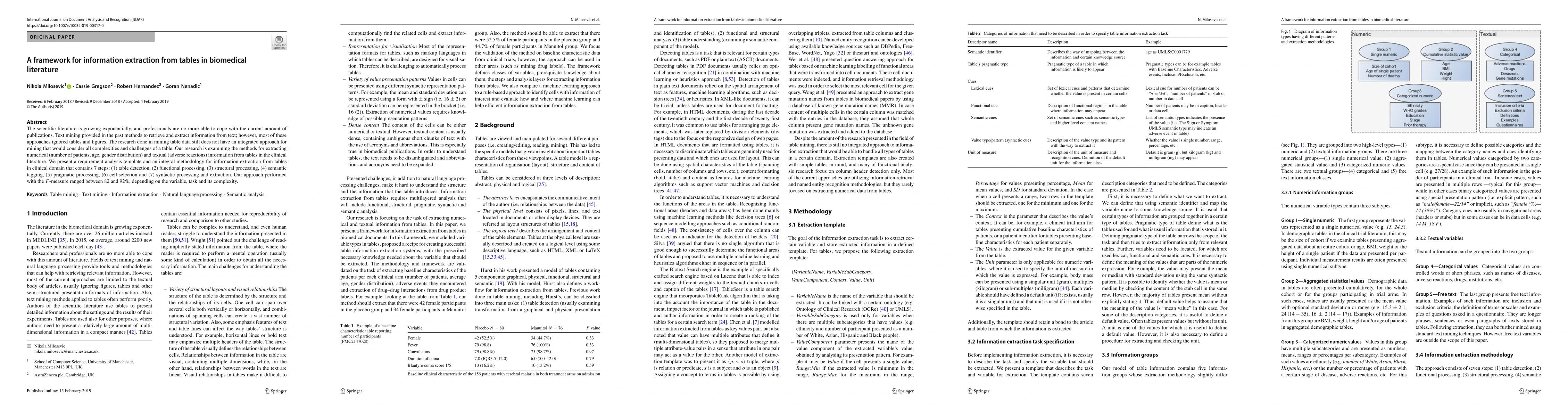 This paper proposes a seven-step framework for extracting both numerical and textual information from tables in biomedical literature. The methodology includes steps like table detection and semantic tagging, achieving an F-measure range of 82-92% in performance.