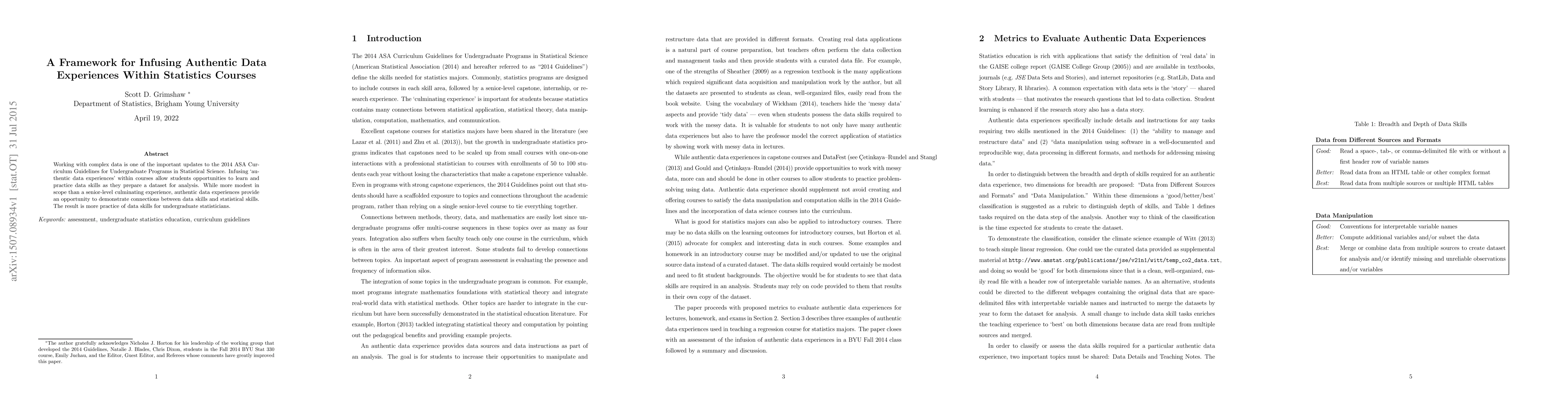 This paper proposes a framework for integrating authentic data experiences into statistics courses, aligning with the 2014 ASA guidelines. It aims to enhance students' data and statistical skills by providing practical, real-world data analysis opportunities.