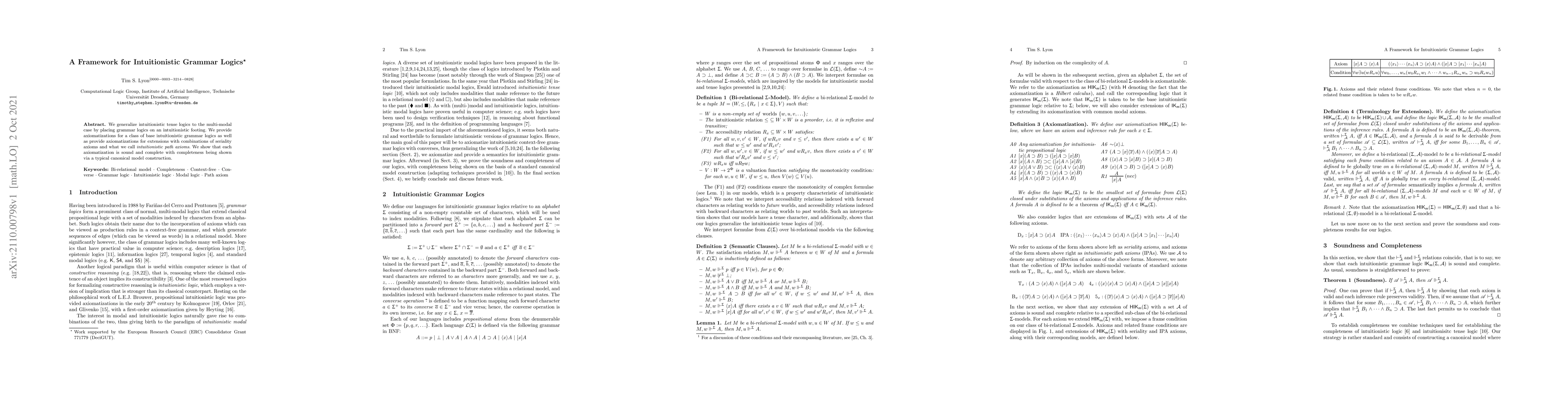 This paper generalizes intuitionistic tense logics to multi-modal grammar logics, providing axiomatizations for base and extended versions with seriality and intuitionistic path axioms. It demonstrates soundness and completeness through canonical model construction.