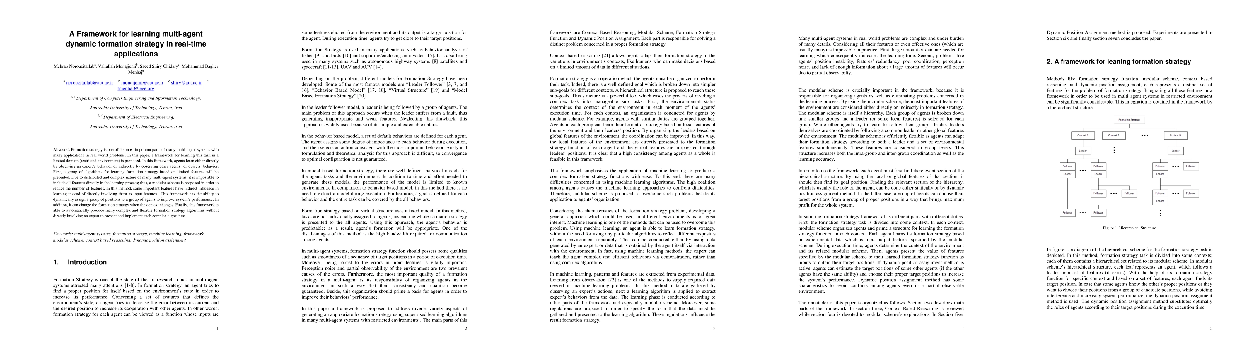 This paper proposes a framework for learning multi-agent dynamic formation strategies in real-time applications, enabling agents to learn through observation of expert or peer behavior. The framework employs a modular scheme to manage complex, distributed systems by reducing the number of direct input features and dynamically adjusting formation strategies based on context changes.