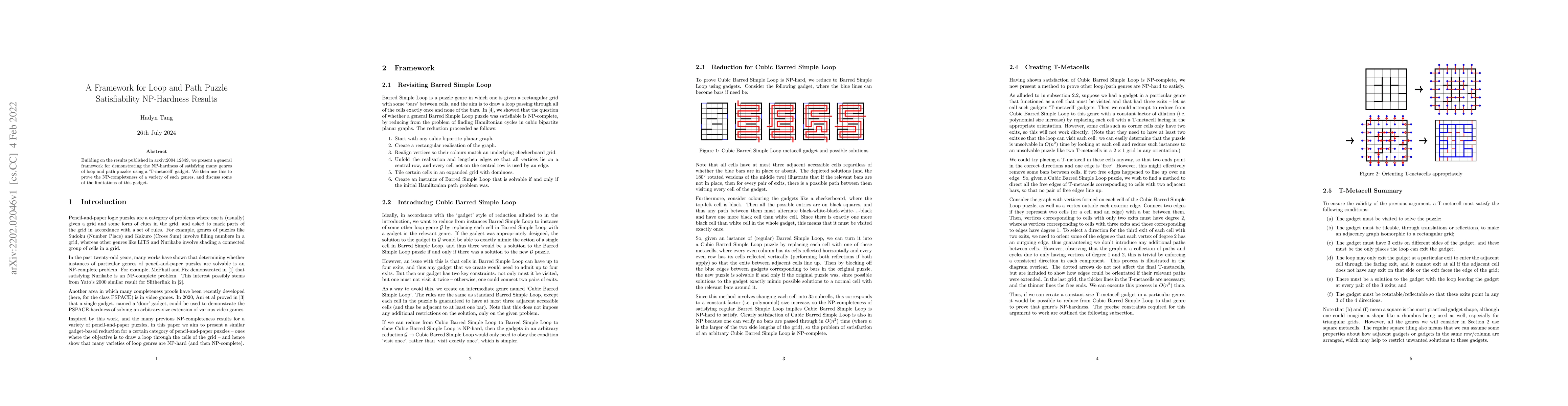 Building on the results published in arxiv:2004.12849 we present a general framework for demonstrating the NP-hardness of satisfying many genres of loop and path puzzles using a 'T-metacell' gadget. We then use this to prove the NP-completeness of a variety of such genres, and discuss some of the limitations of this gadget.