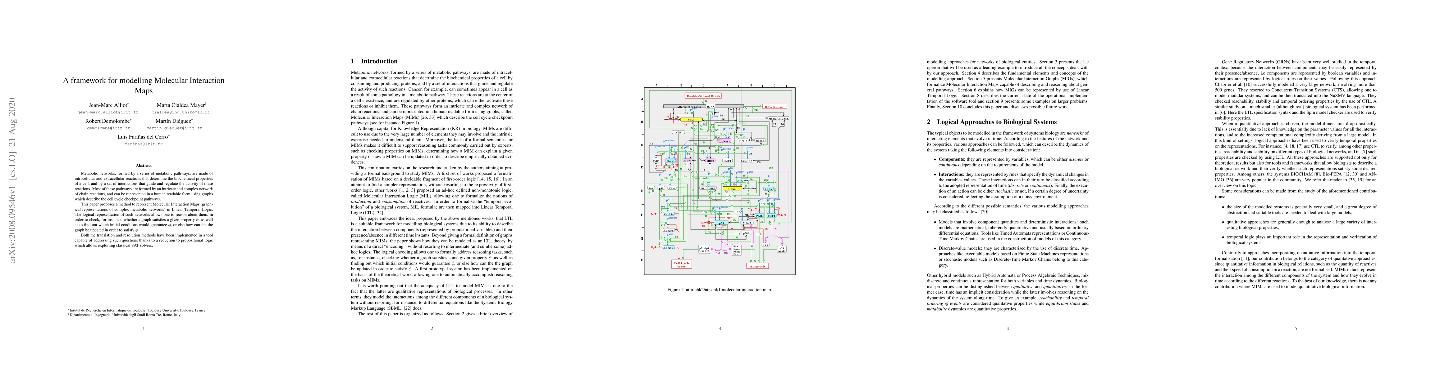 Metabolic networks, formed by a series of metabolic pathways, are made of intracellular and extracellular reactions that determine the biochemical properties of a cell, and by a set of interactions that guide and regulate the activity of these reactions. Most of these pathways are formed by an intricate and complex network of chain reactions, and can be represented in a human readable form using graphs which describe the cell cycle checkpoint pathways. This paper proposes a method to represent Molecular Interaction Maps (graphical representations of complex metabolic networks) in Linear Temporal Logic. The logical representation of such networks allows one to reason about them, in order to check, for instance, whether a graph satisfies a given property $\phi$, as well as to find out which initial conditons would guarantee $\phi$, or else how can the the graph be updated in order to satisfy $\phi$. Both the translation and resolution methods have been implemented in a tool capable of addressing such questions thanks to a reduction to propositional logic which allows exploiting classical SAT solvers.