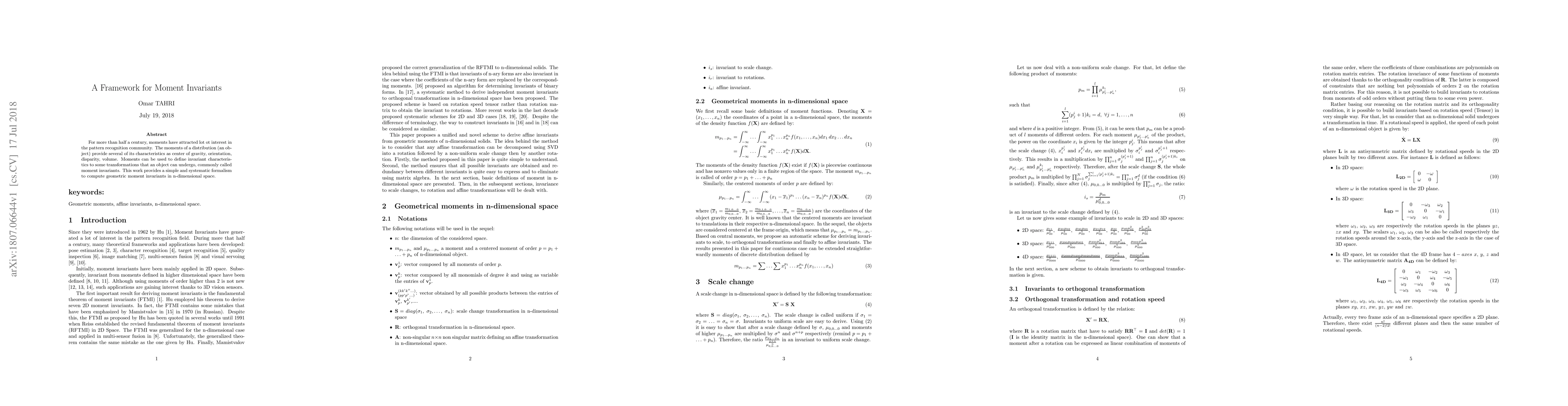 For more than half a century, moments have attracted lot ot interest in the pattern recognition community.The moments of a distribution (an object) provide several of its characteristics as center of gravity, orientation, disparity, volume. Moments can be used to define invariant characteristics to some transformations that an object can undergo, commonly called moment invariants. This work provides a simple and systematic formalism to compute geometric moment invariants in n-dimensional space.