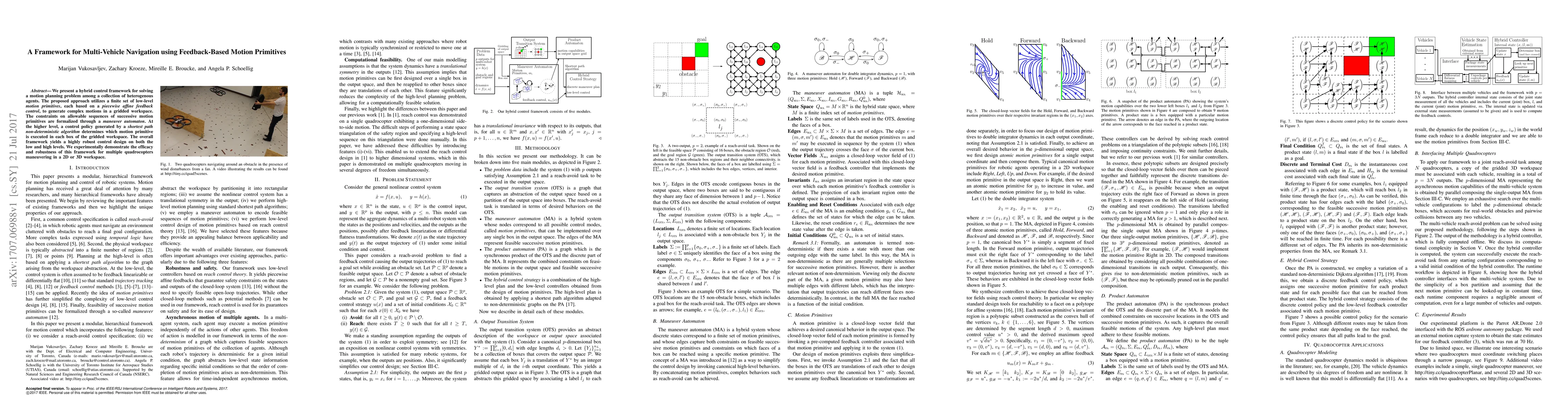 This paper introduces a hybrid control framework for multi-vehicle navigation using feedback-based motion primitives. It combines low-level piecewise affine feedback controls with a maneuver automaton and a high-level shortest path algorithm for robust motion planning among heterogeneous agents in a gridded workspace.