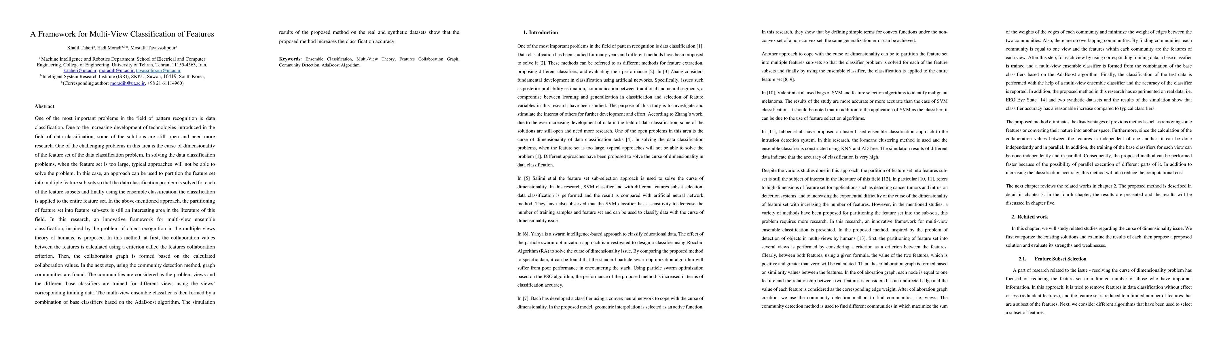 One of the most important problems in the field of pattern recognition is data classification. Due to the increasing development of technologies introduced in the field of data classification, some of the solutions are still open and need more research. One of the challenging problems in this area is the curse of dimensionality of the feature set of the data classification problem. In solving the data classification problems, when the feature set is too large, typical approaches will not be able to solve the problem. In this case, an approach can be used to partition the feature set into multiple feature sub-sets so that the data classification problem is solved for each of the feature subsets and finally using the ensemble classification, the classification is applied to the entire feature set. In the above-mentioned approach, the partitioning of feature set into feature sub-sets is still an interesting area in the literature of this field. In this research, an innovative framework for multi-view ensemble classification, inspired by the problem of object recognition in the multiple views theory of humans, is proposed. In this method, at first, the collaboration values between the features is calculated using a criterion called the features collaboration criterion. Then, the collaboration graph is formed based on the calculated collaboration values. In the next step, using the community detection method, graph communities are found. The communities are considered as the problem views and the different base classifiers are trained for different views using the views corresponding training data. The multi-view ensemble classifier is then formed by a combination of base classifiers based on the AdaBoost algorithm. The simulation results of the proposed method on the real and synthetic datasets show that the proposed method increases the classification accuracy.