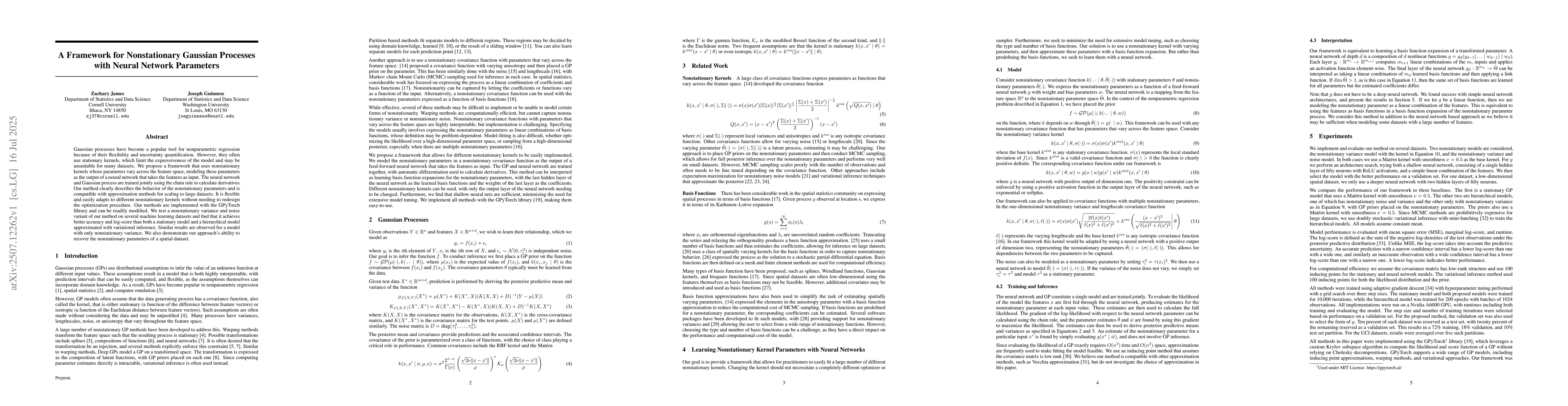 Gaussian processes have become a popular tool for nonparametric regression because of their flexibility and uncertainty quantification. However, they often use stationary kernels, which limit the expressiveness of the model and may be unsuitable for many datasets. We propose a framework that uses nonstationary kernels whose parameters vary across the feature space, modeling these parameters as the output of a neural network that takes the features as input. The neural network and Gaussian process are trained jointly using the chain rule to calculate derivatives. Our method clearly describes the behavior of the nonstationary parameters and is compatible with approximation methods for scaling to large datasets. It is flexible and easily adapts to different nonstationary kernels without needing to redesign the optimization procedure. Our methods are implemented with the GPyTorch library and can be readily modified. We test a nonstationary variance and noise variant of our method on several machine learning datasets and find that it achieves better accuracy and log-score than both a stationary model and a hierarchical model approximated with variational inference. Similar results are observed for a model with only nonstationary variance. We also demonstrate our approach's ability to recover the nonstationary parameters of a spatial dataset.