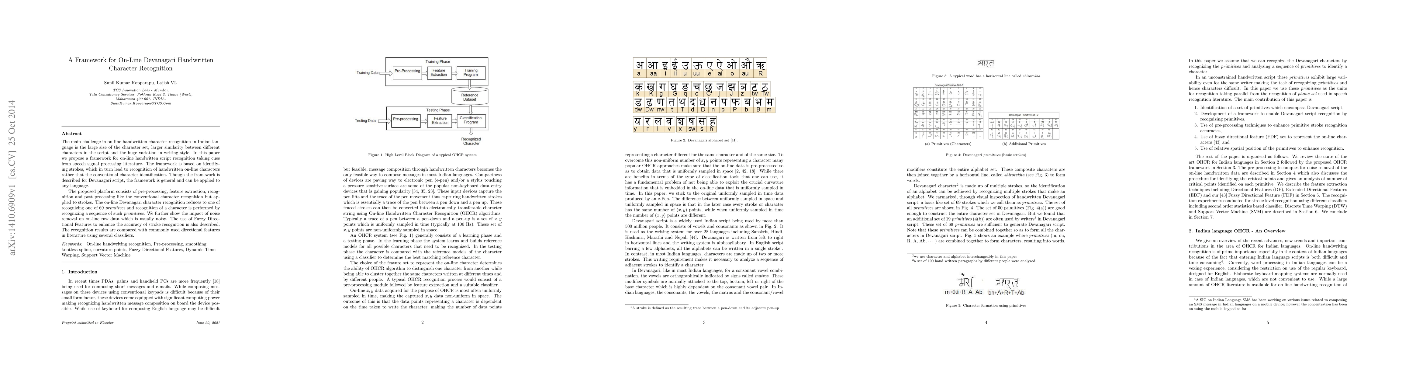 The paper proposes a framework for online Devanagari handwritten character recognition, inspired by speech signal processing. It involves pre-processing, feature extraction, recognition, and post-processing, focusing on identifying strokes leading to character recognition rather than direct character identification.